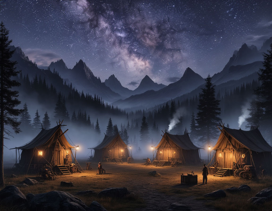Камера медленно открывает мир: ночное небо, усеянное звёздами, и силуэты гор, окутанные туманом. Внизу — огни охотничьего лагеря.
