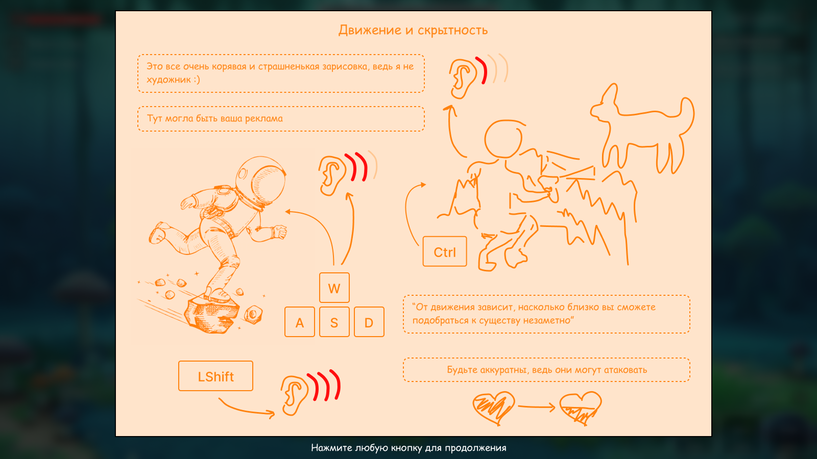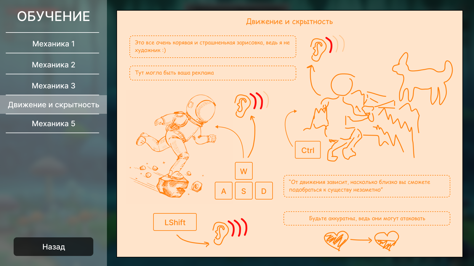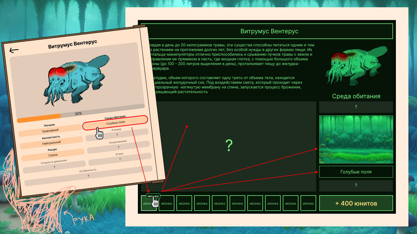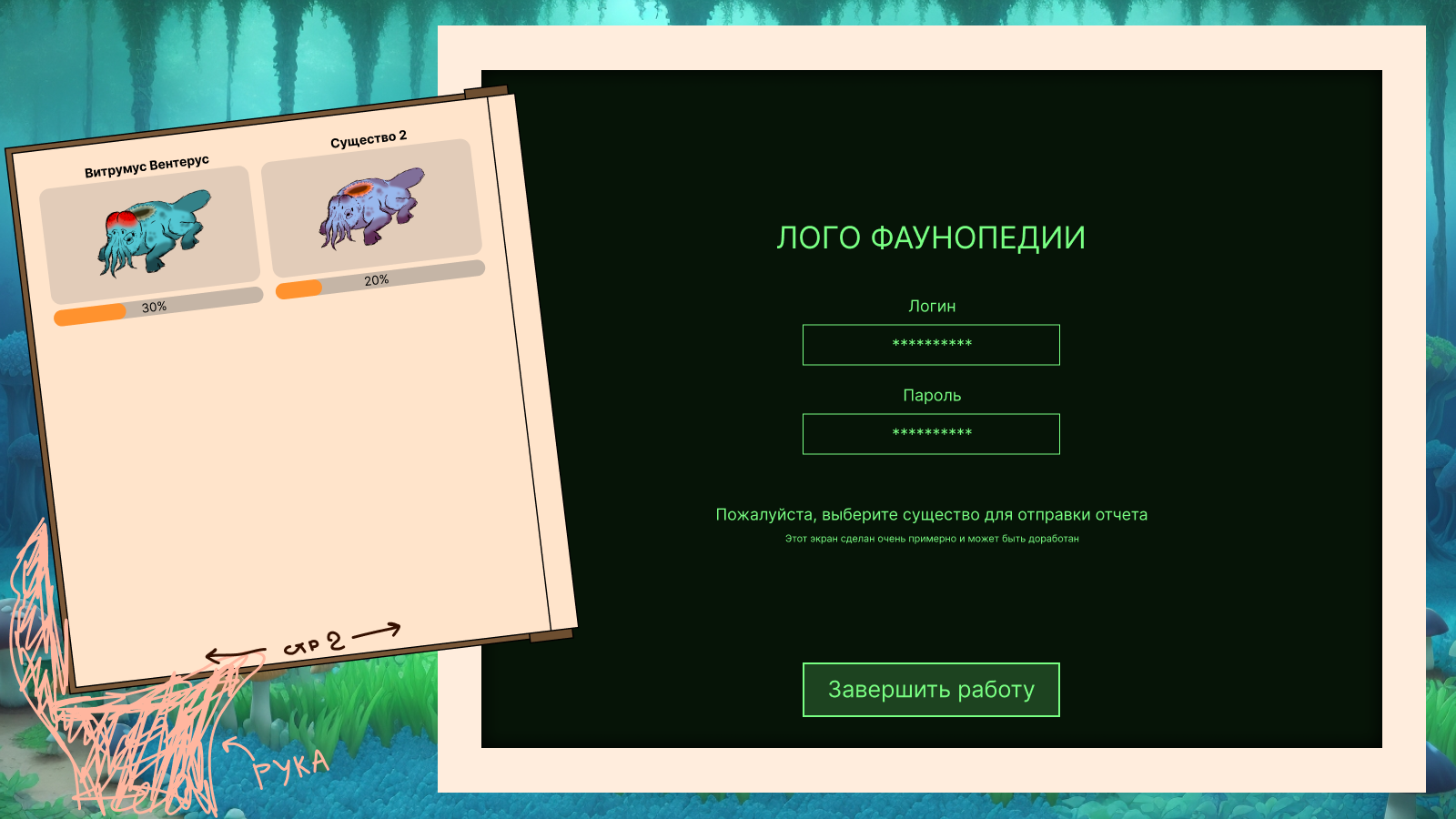 Дневник открывается при нажатии на кнопку "G" и содержит информацию о всех открытых существах и биомах. Здесь же происходит изучение существа, путем поиска слов в тексте и переноса их в соответствующие поля