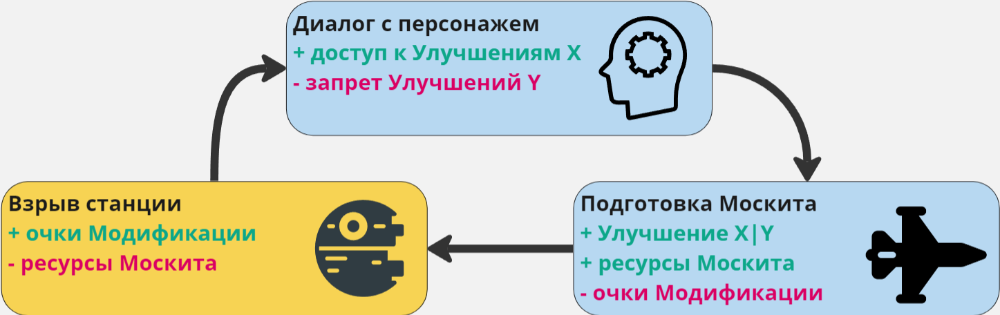 - Игрок взрывает станцию, получает очки Модификации.