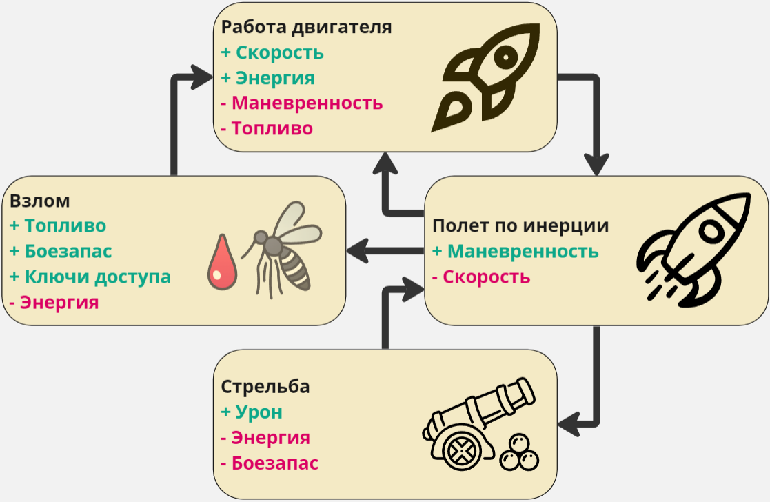 - Игрок активирует маршевые двигатели, для получения Скорости и Энергии, затрачивая Топливо и жертвую Маневренностью.