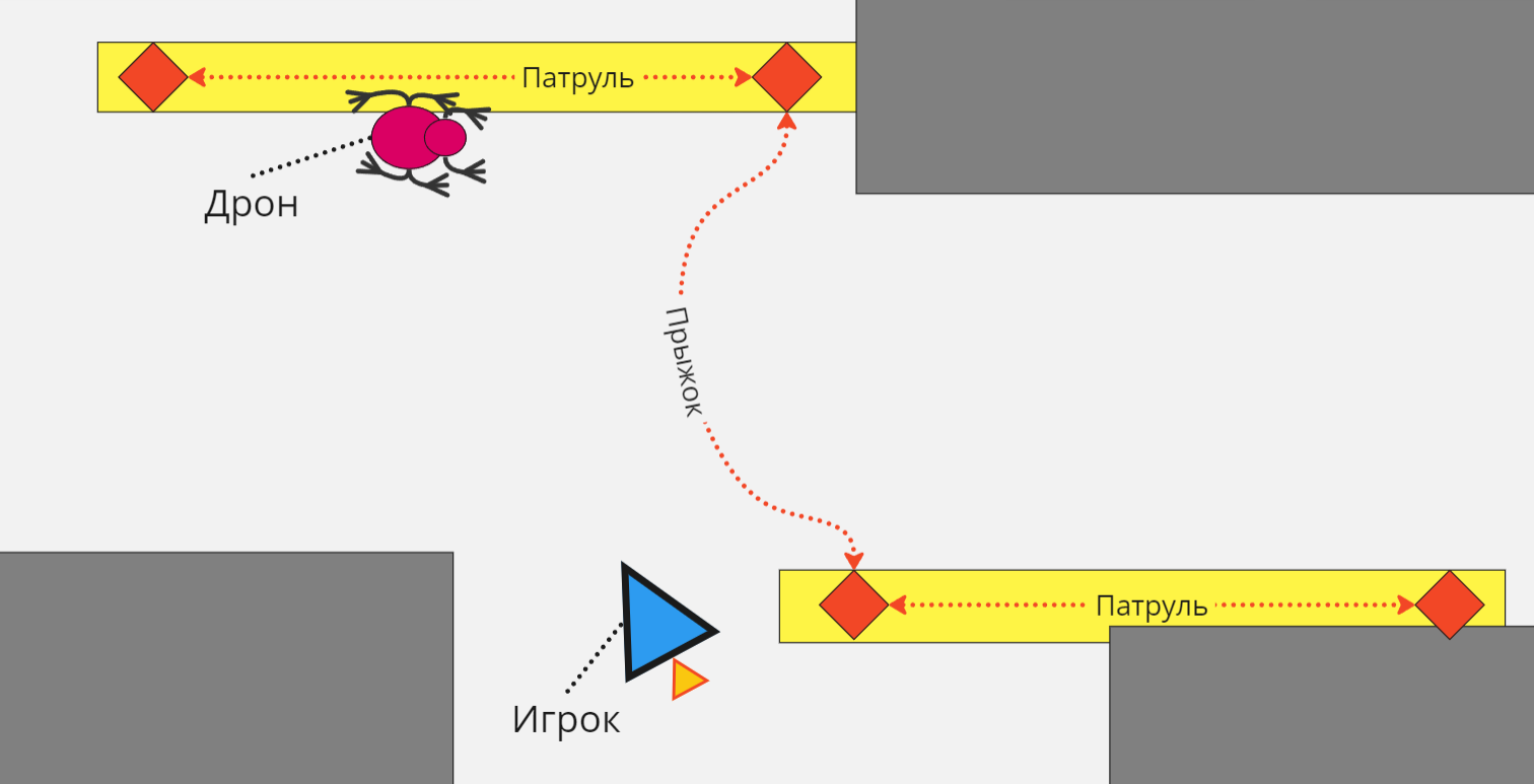 Дроны привязаны к одной или двум платформам. Могут перемещаться по платформе вправо-влево и перепрыгивать с одной платформы на другую.