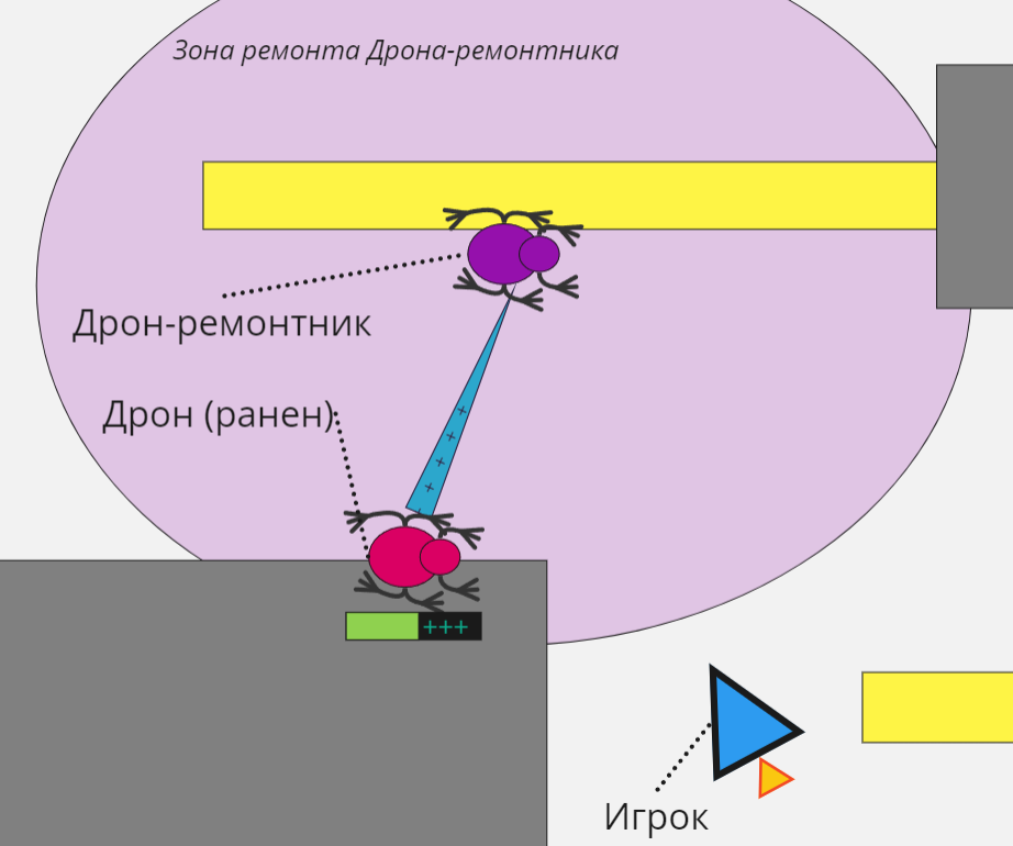 - Дрон-ремонтник: по характеристикам близок обычному дрону, но имеет другое оружие и умеет ремонтировать других роботов.