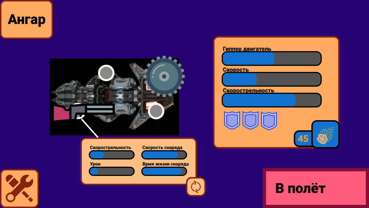 Игрок может перейти в ангар, в котором можно выбрать другой корабль, посмотреть характеристики или открыть недоступные элементы.