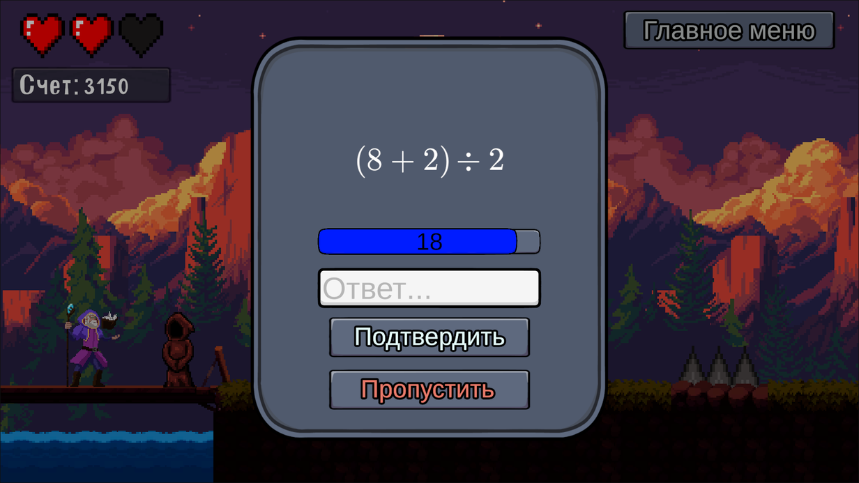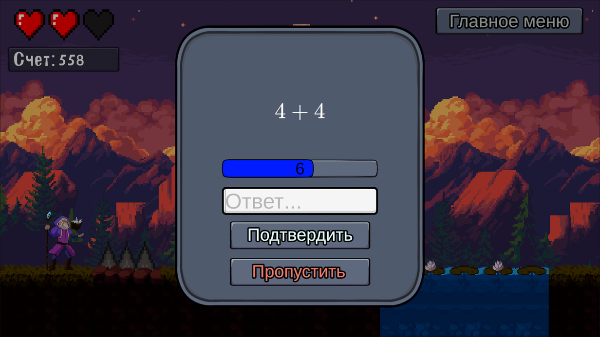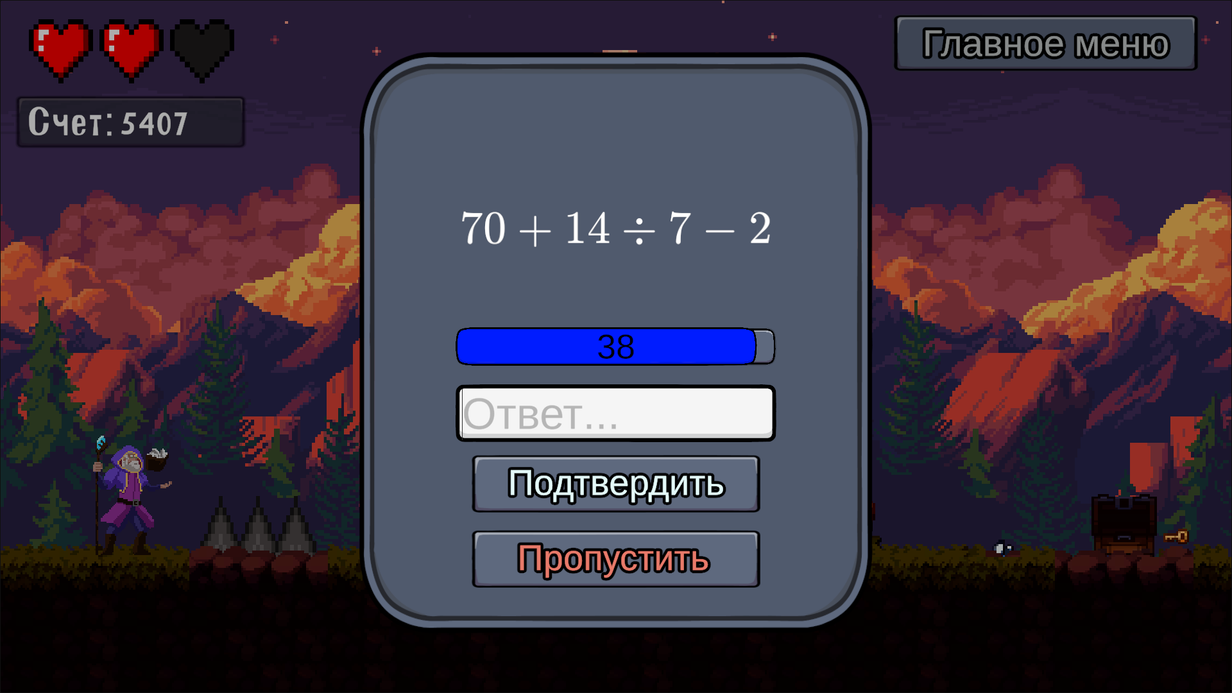 В мире, где магия и математика неразделимы, Вам предстоит взять на себя роль Магистра Математики, мага, владеющего силой чисел. Ваша задача — путешествовать по землям Алгебраии, решая сложные математические загадки и формулы, чтобы преодолевать препятствия и побеждать противников. Однако сложность вашего приключения будет постепенно нарастать, Вы начинаете с простого сложения и вычитания, а закончите решением уравнений с дробями.