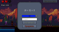 - При встрече с препятствием появится окно с математическим выражением, полем для ввода ответа и таймером, иногда имеется дополнительное описание.