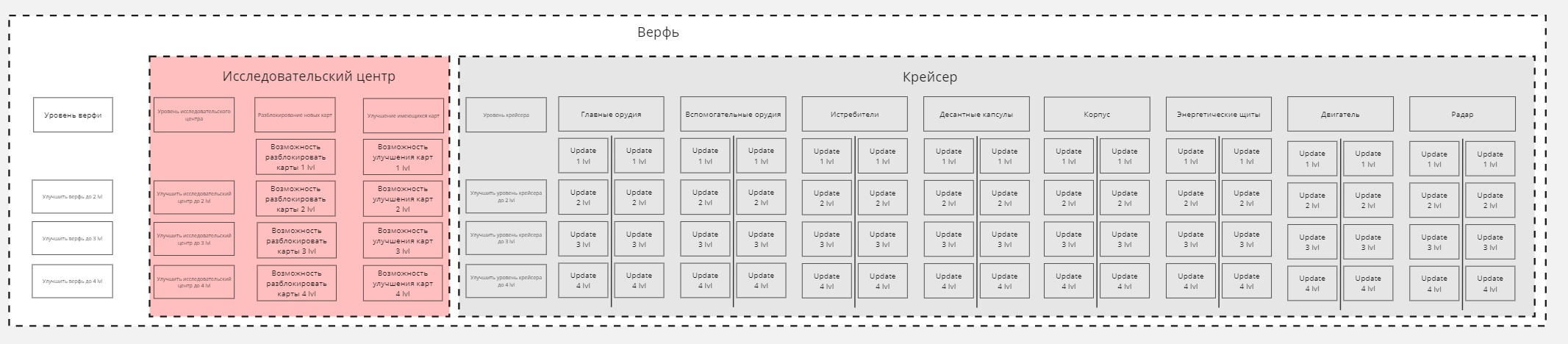 Игрок должен улучшать верфь (хаб), лабораторию и сам крейсер за очки победы.