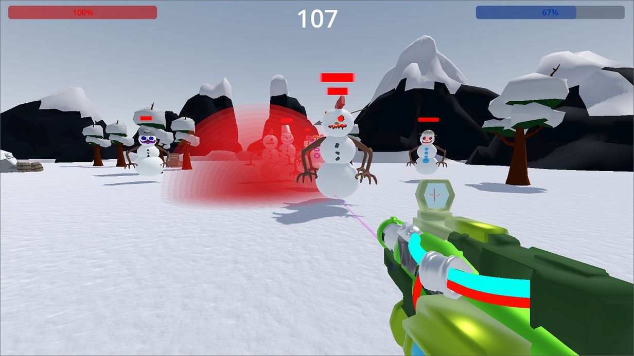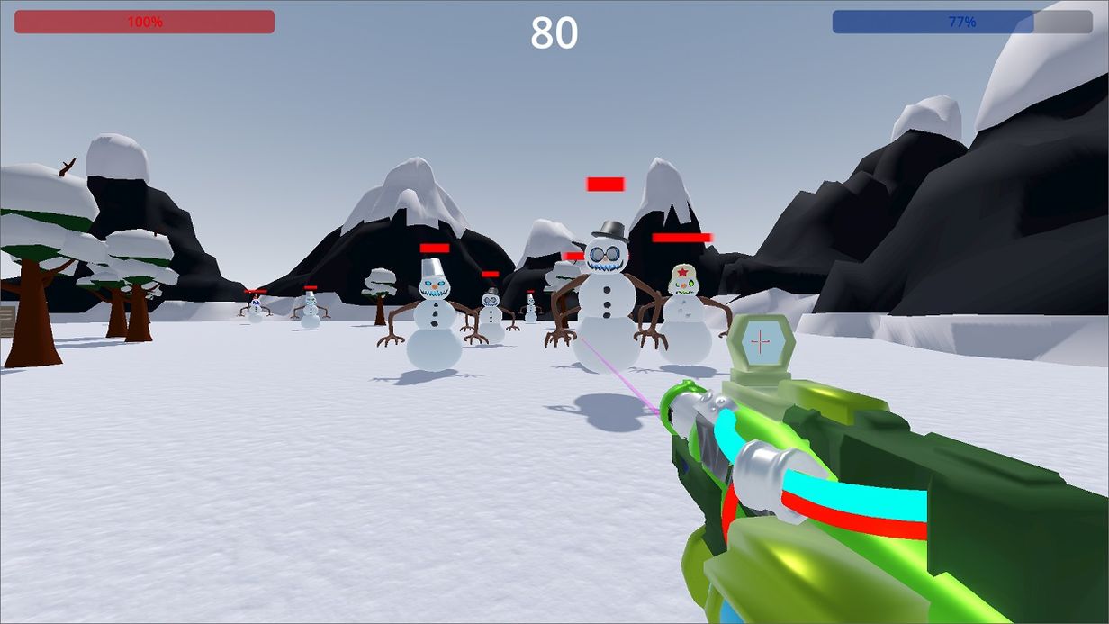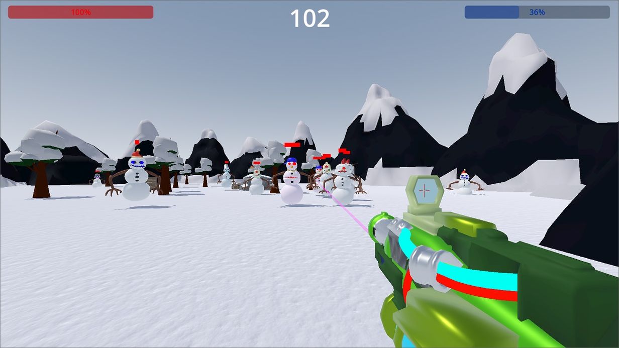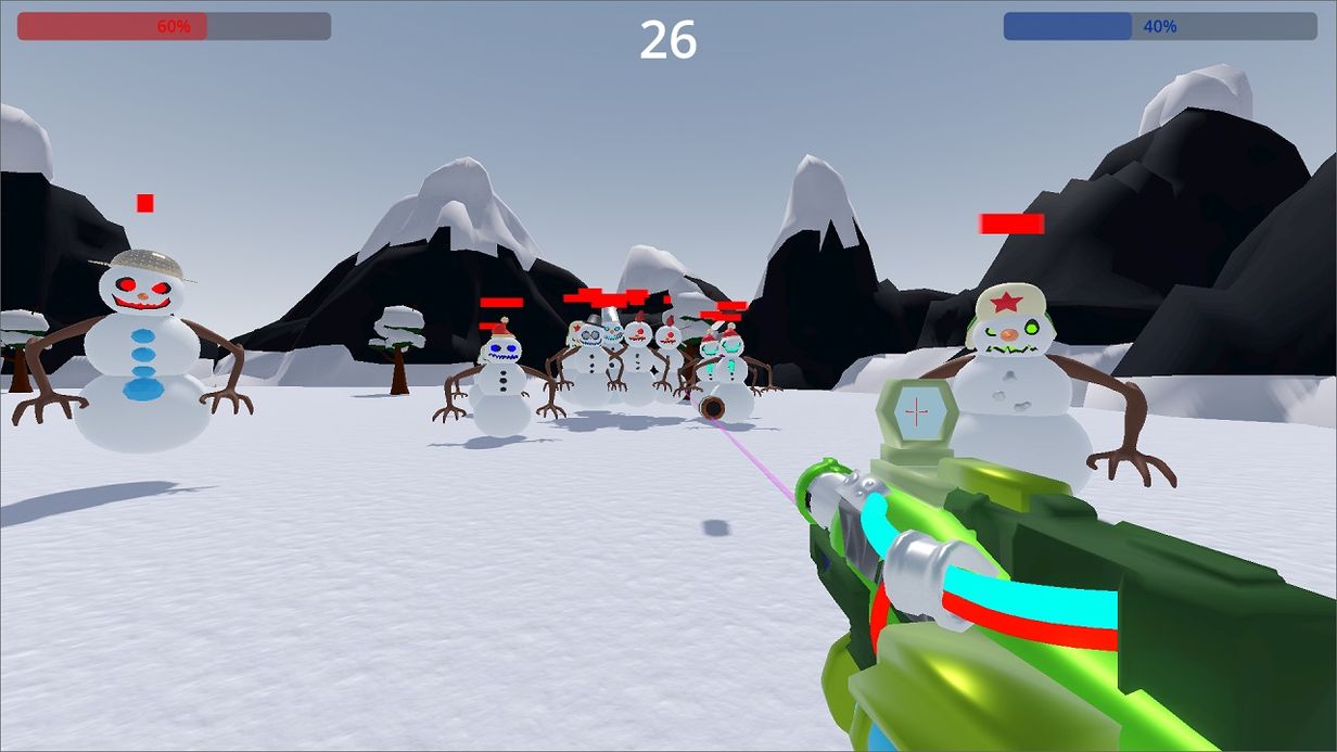 Ваша задача - выжить и продержаться 2 минуты в суровых условиях заснеженной локации, где снеговики не просто статуи, а истинные враги, готовые напасть на вас.