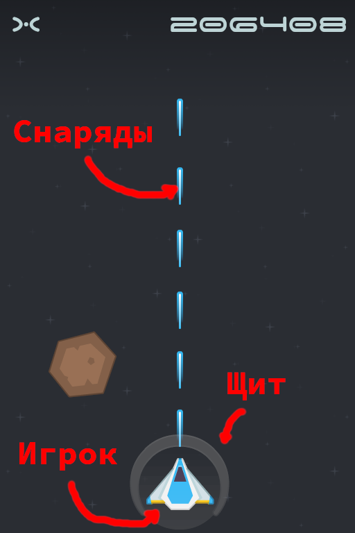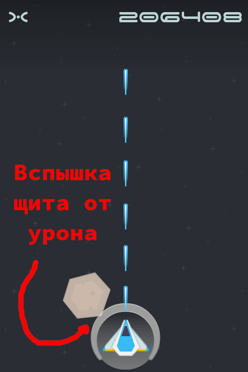 Корабль игрока. Может двигаться по всей области экрана, но не заходя на UI (Интерфейс). Стреляет во врагов, имеет неуязвимый щит. Способен подбирать бонусы (Шаблон бонуса ), сталкиваться с астероидами (http://ims.cr5.space/app/p/FDFBrSVi/primer-proekta/a/6e0a8861-9f18-42c0-9461-60bcc81818d7">Враг - 1, "Астероид") и другими врагами. Корабль окружён неуязвимым щитом, щит вспыхивает белым при попадании снаряда или столкновении.