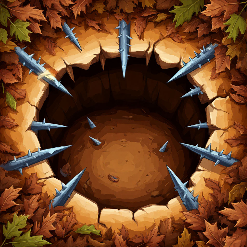A classic pit, strewn with sharp spikes at the bottom, often covered with a layer of dry leaves.