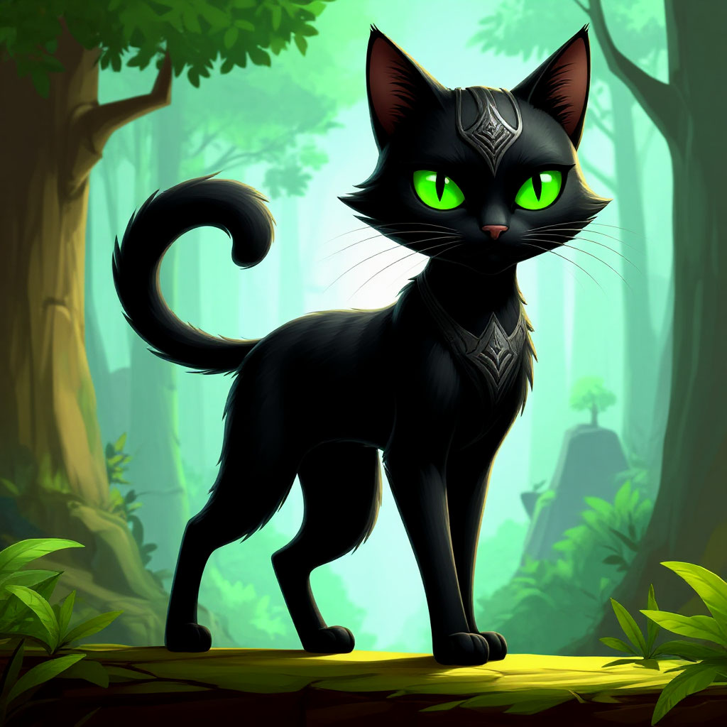 A slender, graceful cat with black fur and bright green eyes. A dark mask, like a ninja's, covers her face. Her movements are smooth, silent, and full of hidden power.