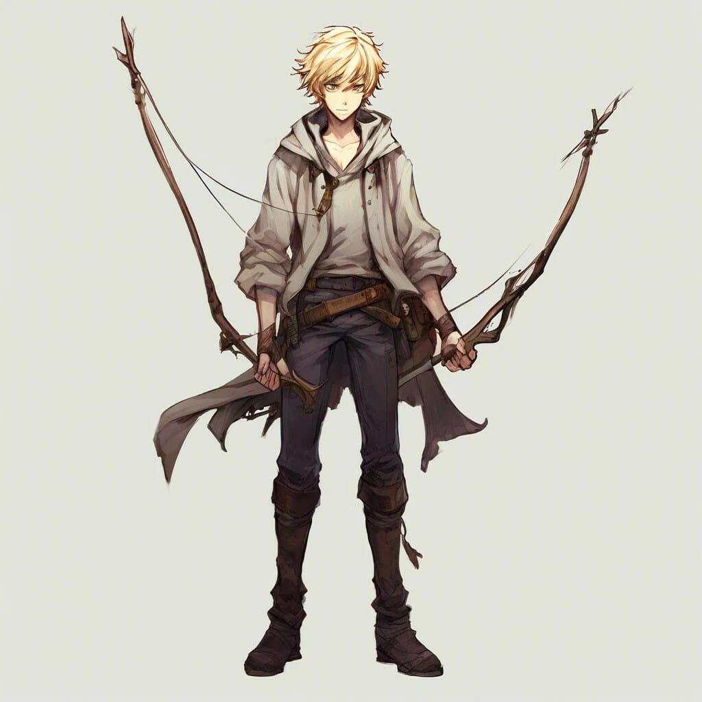 Молодой парень, рост 190. одет в поношенную одежду спокойных тонов. Стреляет из лука магическими стрелами, Может атаковать с дальнего расстояния