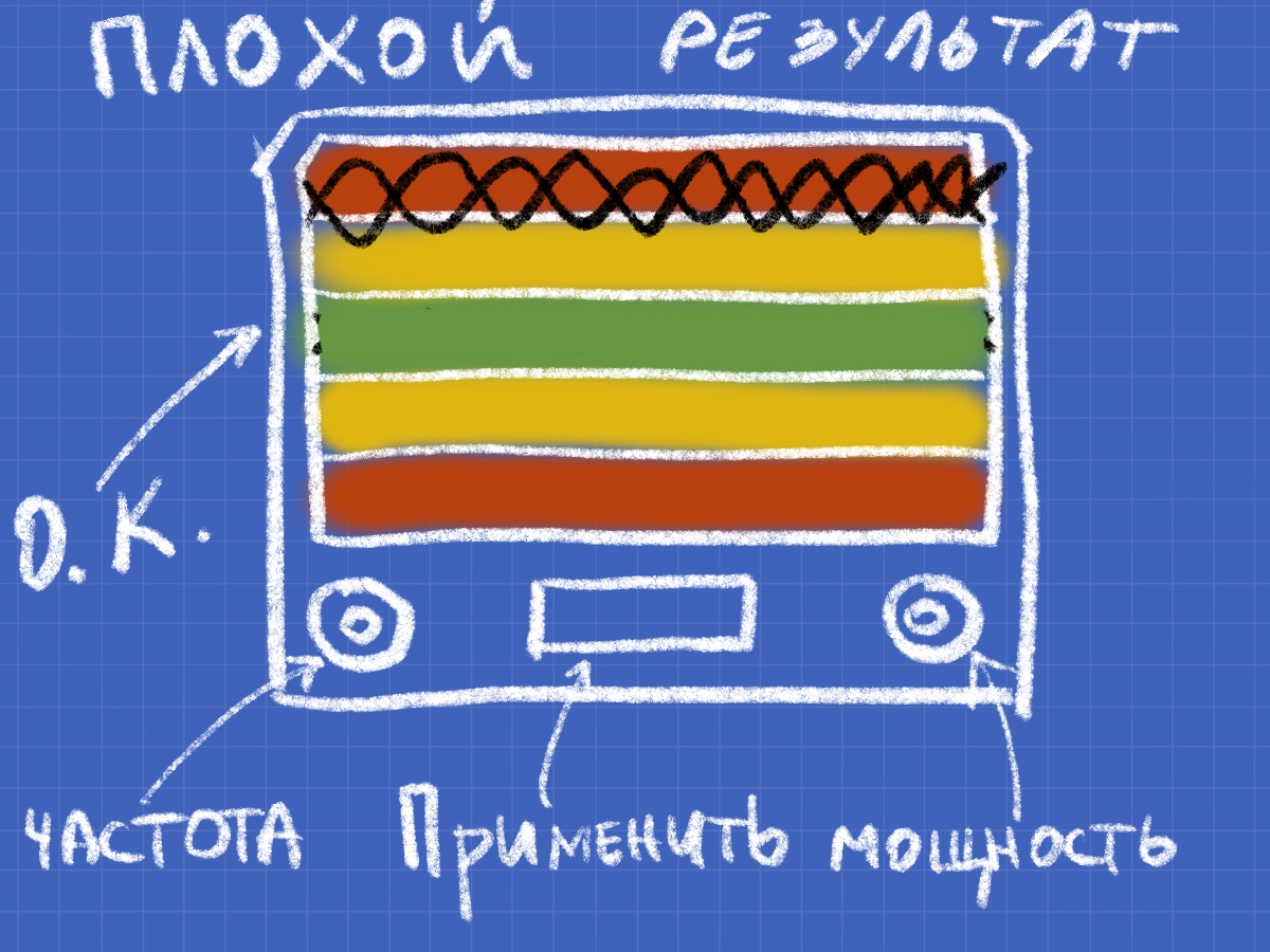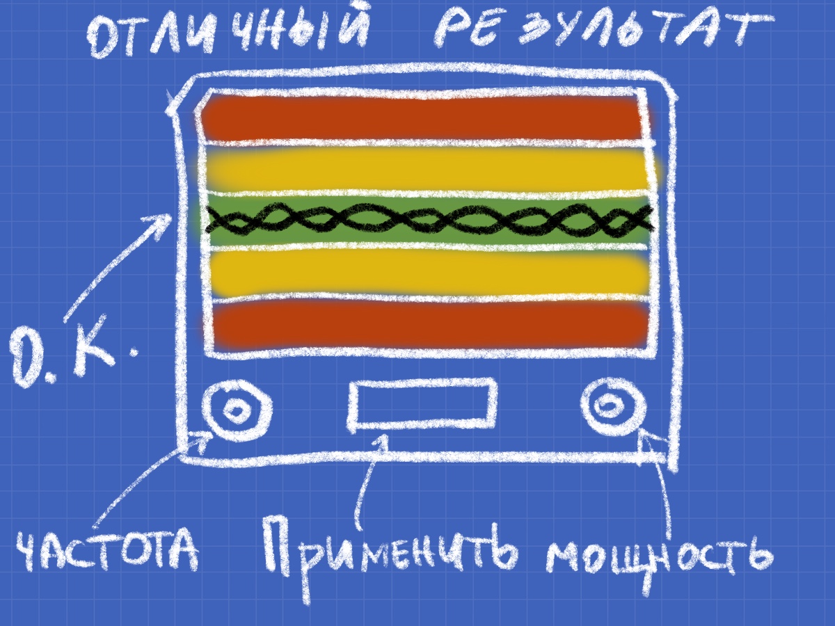- Игрок использует кнопку Частота, чтобы переместить индикатор сигнала( виде синусоиды) в оптимальную зону на графике.