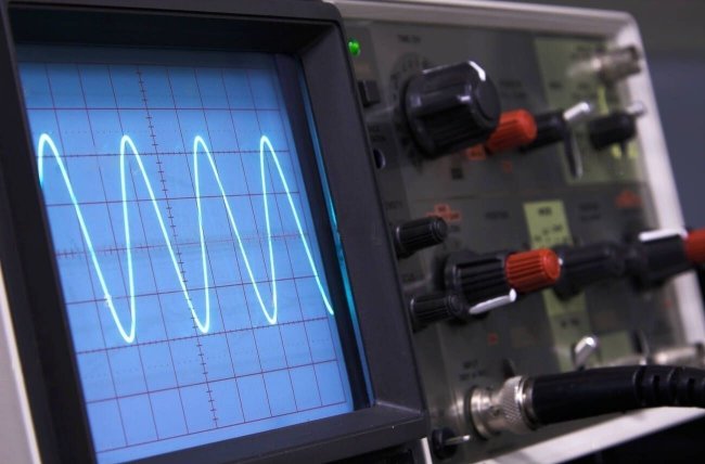 - Одно нажатие запускает процесс и индикатор сигнала(в начале это одна синусоида) раздваивается и начинает импульсимно и хаотично перемещаться вверх и вниз, относительно друг друга, по экрану.