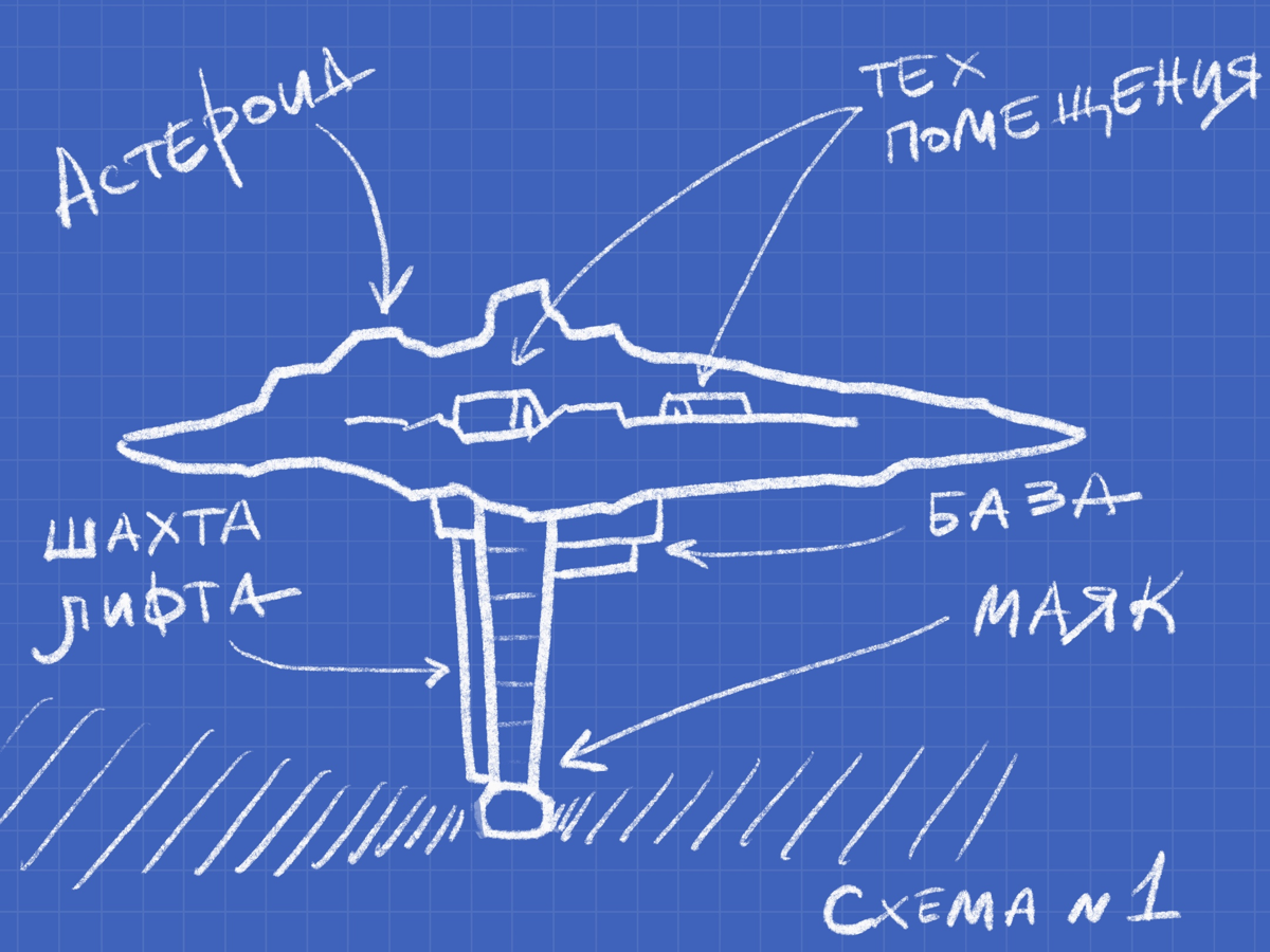 Башня маяка и основные рабочие помещения установлены не на поверхности астероида, а снизу.