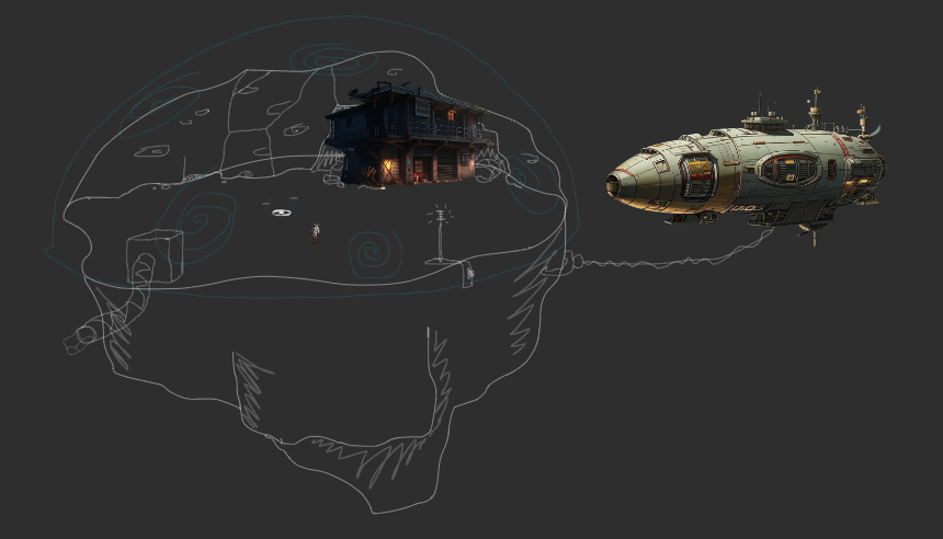 Космический корабль игрока прикреплен к стартовому астероиду вначале игры.