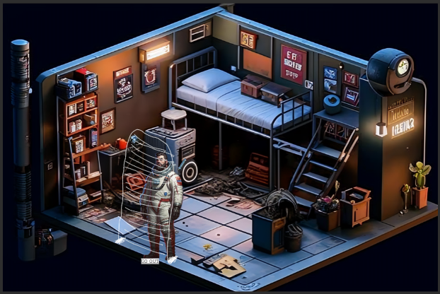 Внутри находится комната, где главный герой может перемещаться и использовать рабочий стол для изучения улик.