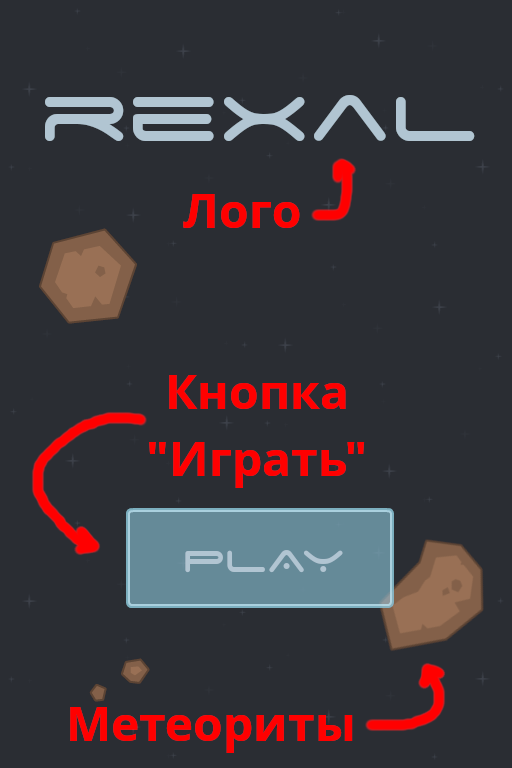 В главном меню расположены лого и кнопка "Играть" с небольшой прозрачностью. На фоне космос и медленно летающие метеориты.