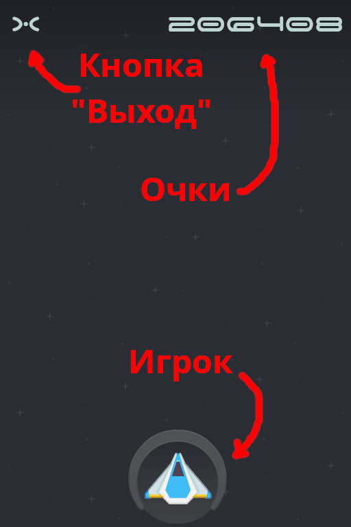 В верхней части экрана есть подложка из градиента, чтобы выделить элементы интерфейса. В верхнем левом углу расположена кнопка "Выход". В правом верхнем углу расположен счётчик очков.