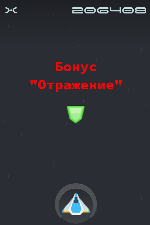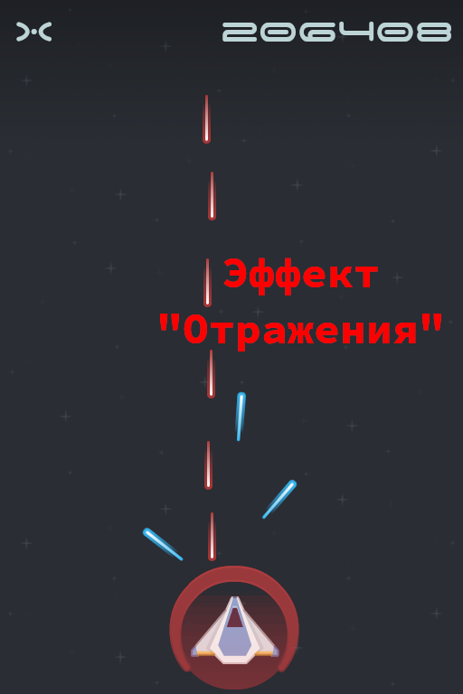 При подборе щит корабля становится красным и начинает отражать снаряды врагов в случайных направлениях. Отражённые снаряды имеют цвет снарядов игрока и могут поражать врагов. Действует 60 секунд.