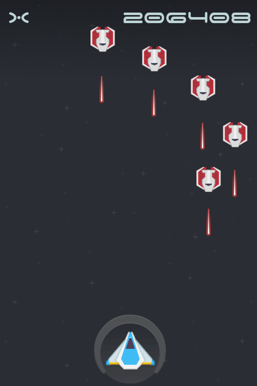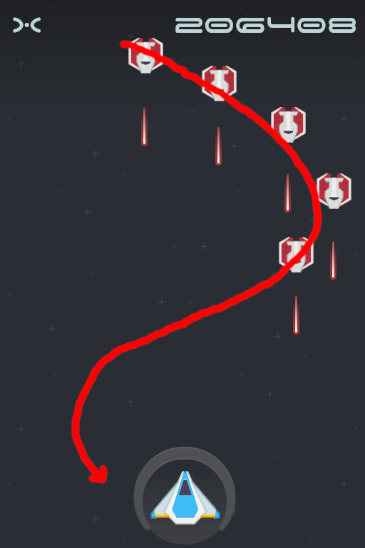 Движется по экрану не только сверху вниз, но и влево-вправо на всю ширину экрана. Вылетает группами по 10 штук. Стреляет вперёд 2-5 раз всекунду.