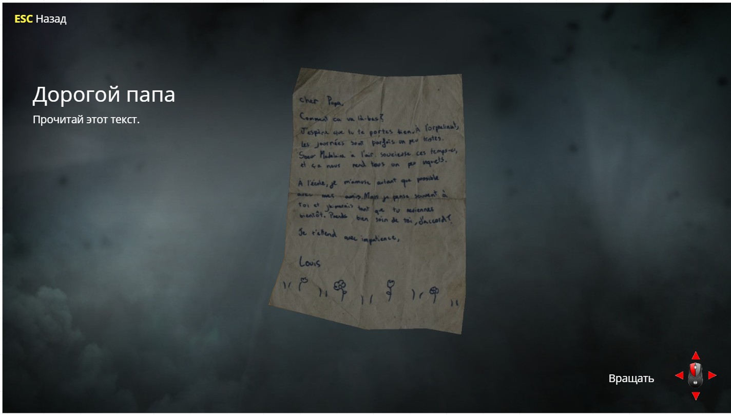 - слева от предмета — его описание ; в случае записки — переведенный текст (полностью или частично)