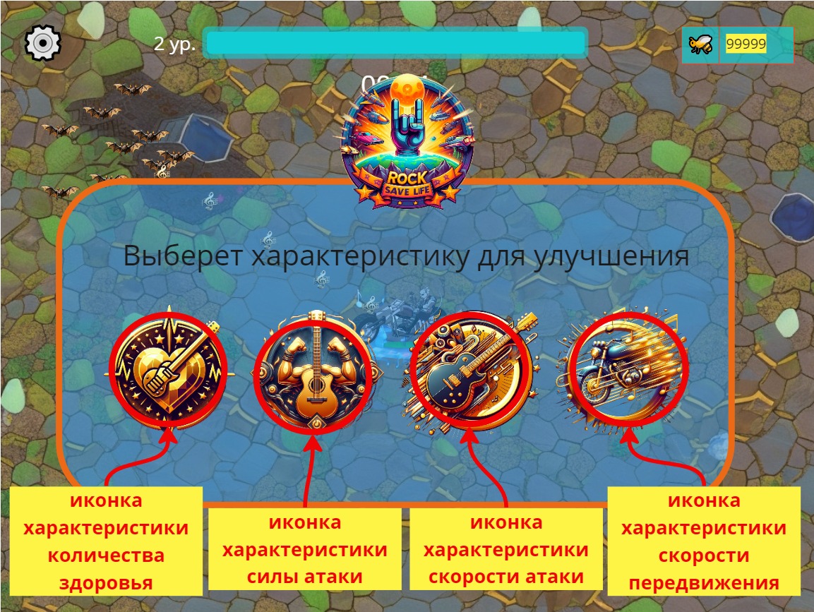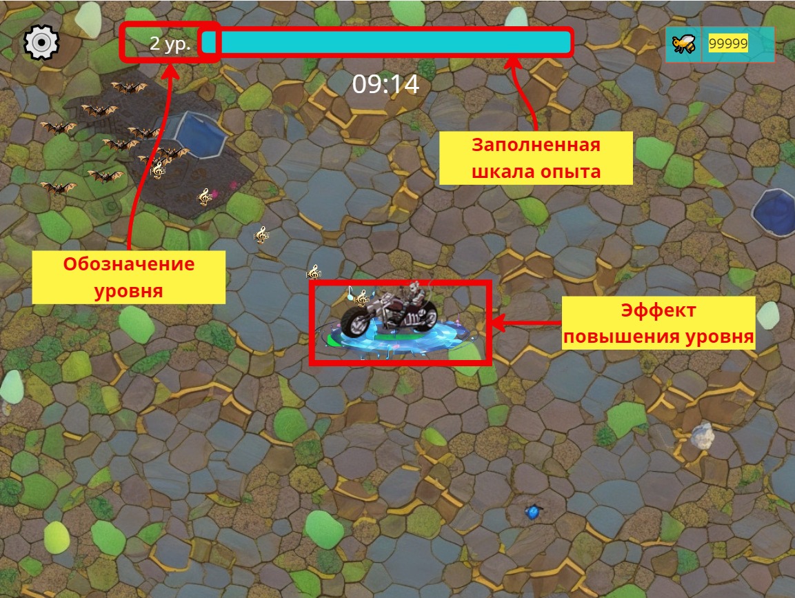При наборе определённого количества очков опыта персонаж повышает свой уровень. Визуально это выглядит как представлено на первом изображении галереи. Как только получен новый уровень, на экране возникает экран прокачки, где игроку необходимо вложить очко прокачки в один из базовых параметров (скорость передвижения, скорость атаки, количество здоровья или силу атаки). Каждое вложенно очко прокачки увеличивает показатель на 5%.