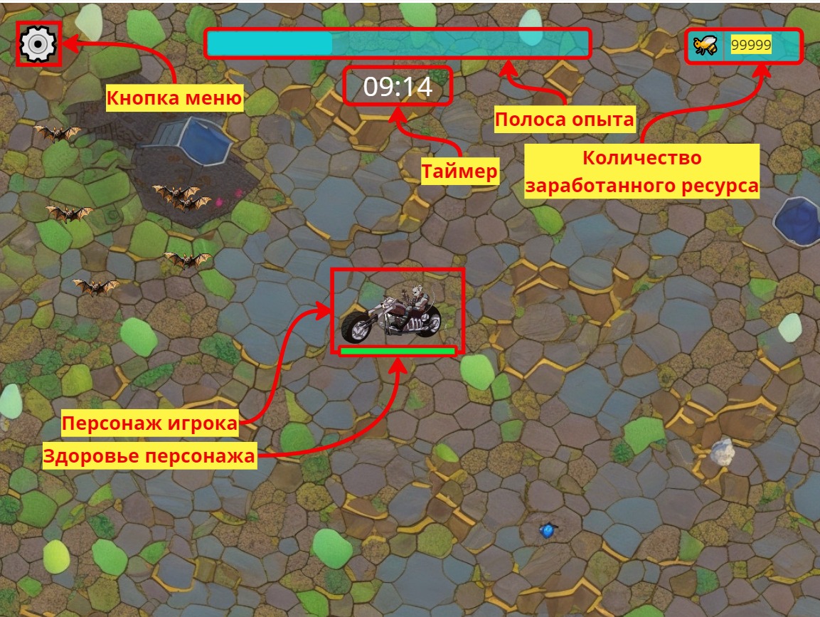 В верхней части экрана есть подложка из градиента, чтобы выделить элементы интерфейса. В верхнем левом углу расположена кнопка "Меню". В правом верхнем углу расположен счётчик ресурсов. По середине сверху экрана расположена полоса опыта. Под полосой опыта расположен таймер пребывания на вылазке. Персонаж игрока находится в центре экрана. Под персонажем расположена шкала здоровья персонажа. По уровню