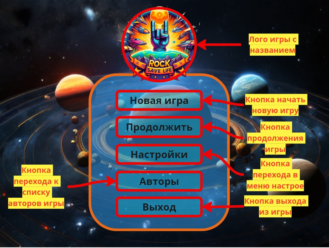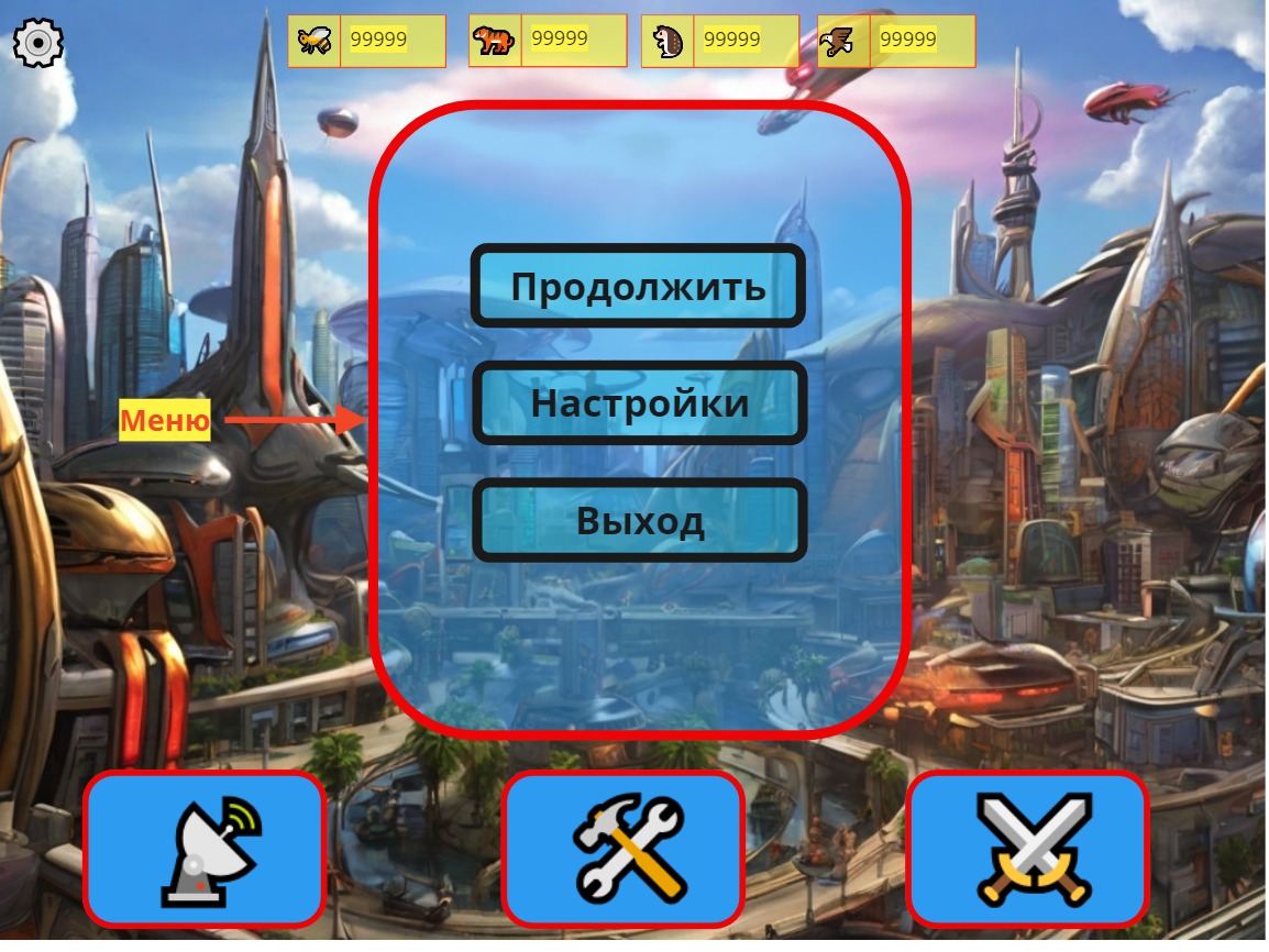 Меню: кнопки "Продолжить", "Настройки", " Выход"
