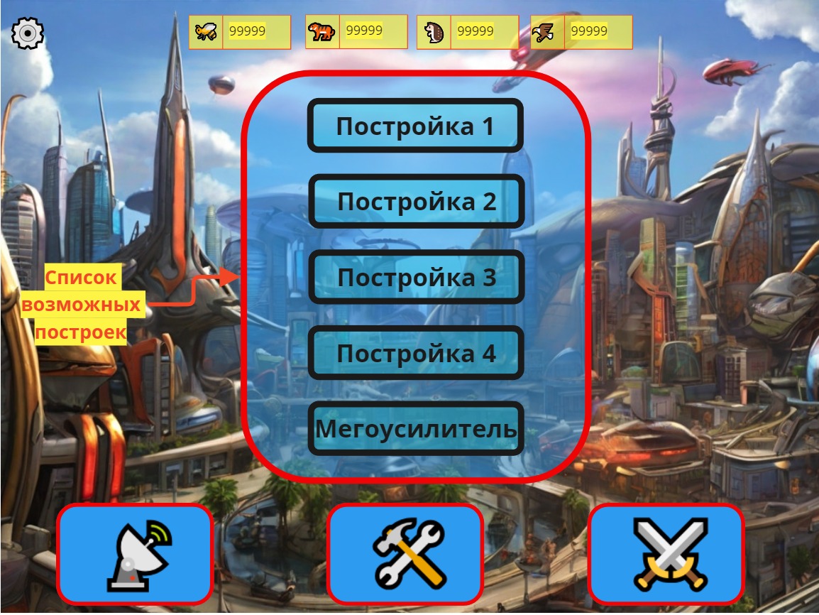 Меню строительства: список всех возможных зданий и усилитель, кнопки постройки становятся активными при достаточном количестве ресурсов.