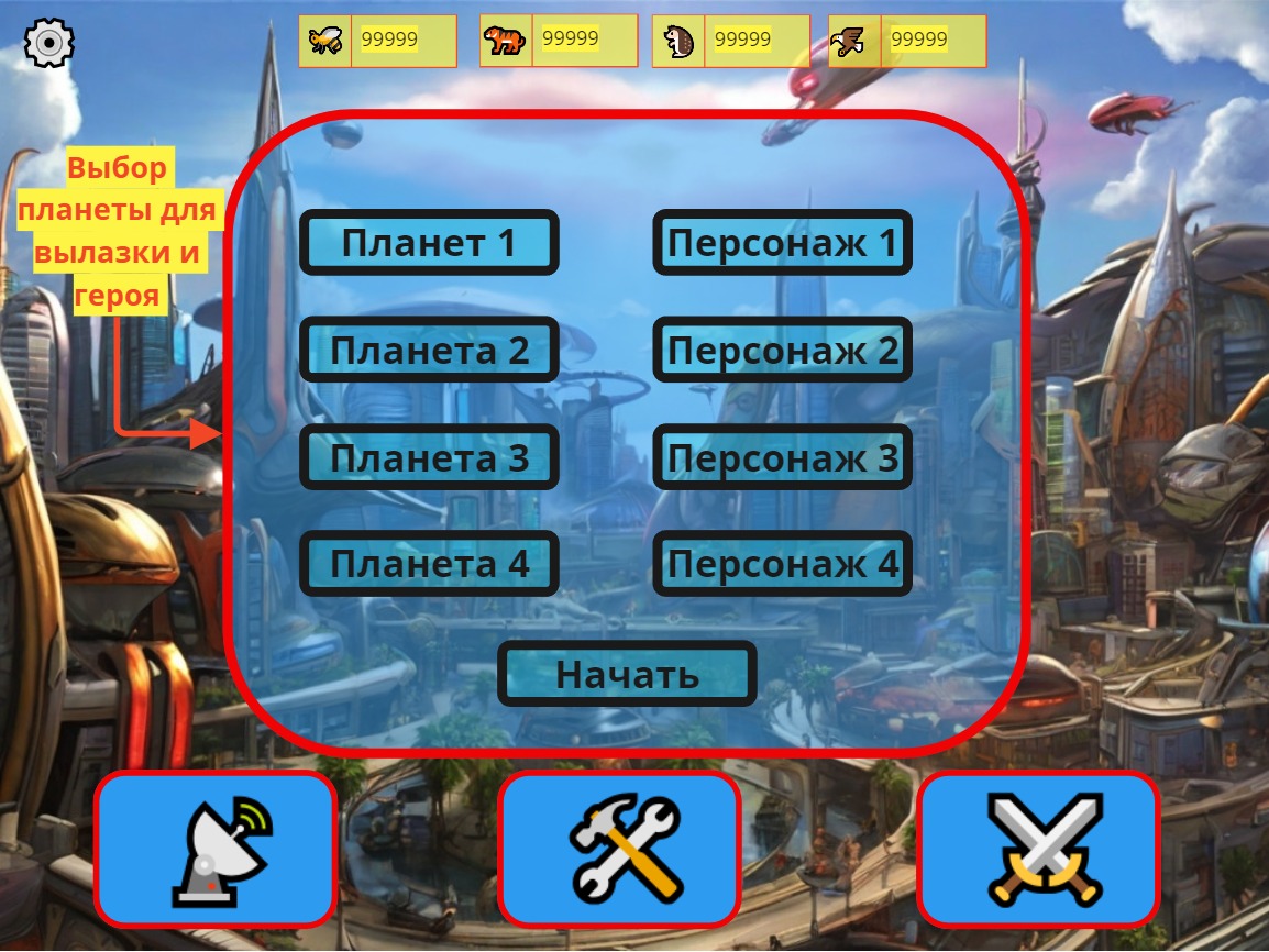 Меню вылазки: список доступных героев постройки которых уже активированы и список планет для отправки за ресурсами.