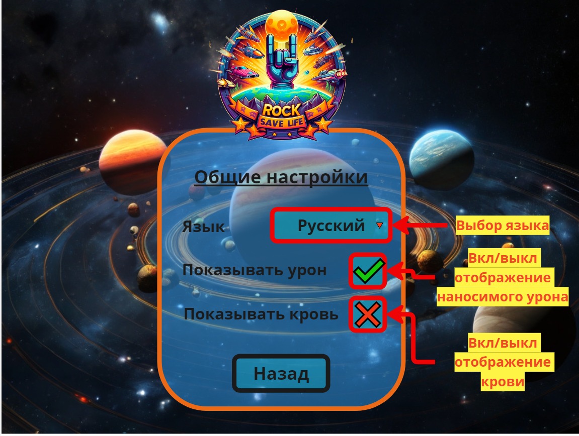 Общие настройки: Смена языка, Включение/отключение отображения урона, Включение/отключение отображения крови