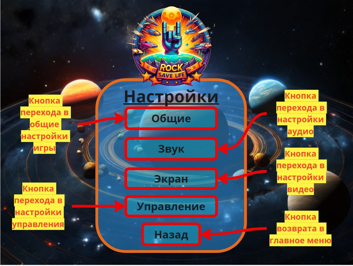 Настройки: Кнопки "Общие", "Звук", "Экран", Управление", "Назад"