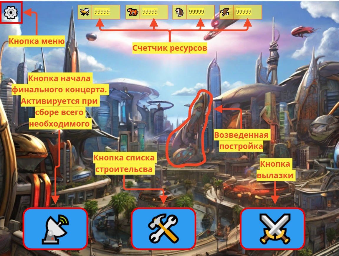 База представляет собой подобие города из Героев 3. Сверху слева кнопка выхода в меню. По середине сверху расположен счетчик ресурсов имеющихся в наличии у игрока. Основной экран - город с постройками. Внизу экрана расположены кнопки "Начать концерт", "Меню возведения построек", "Вылазка"