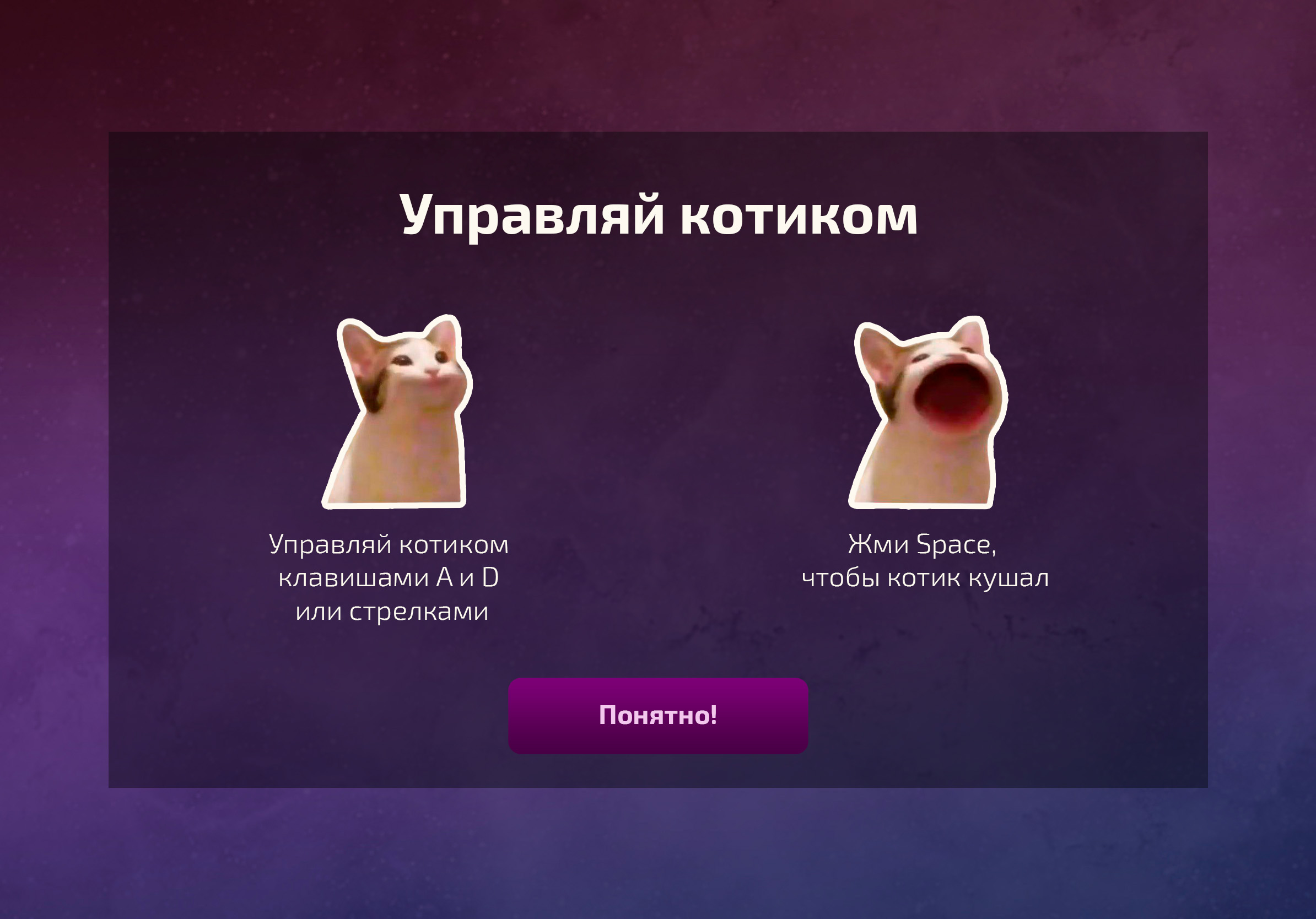 Котик хочет питаться вкусно и полезно, но не знает, как выбирать продукты. Управляй котиком, помогай ему придерживаться выбранного режима питания, а также узнавай новые факты о знакомой еде!