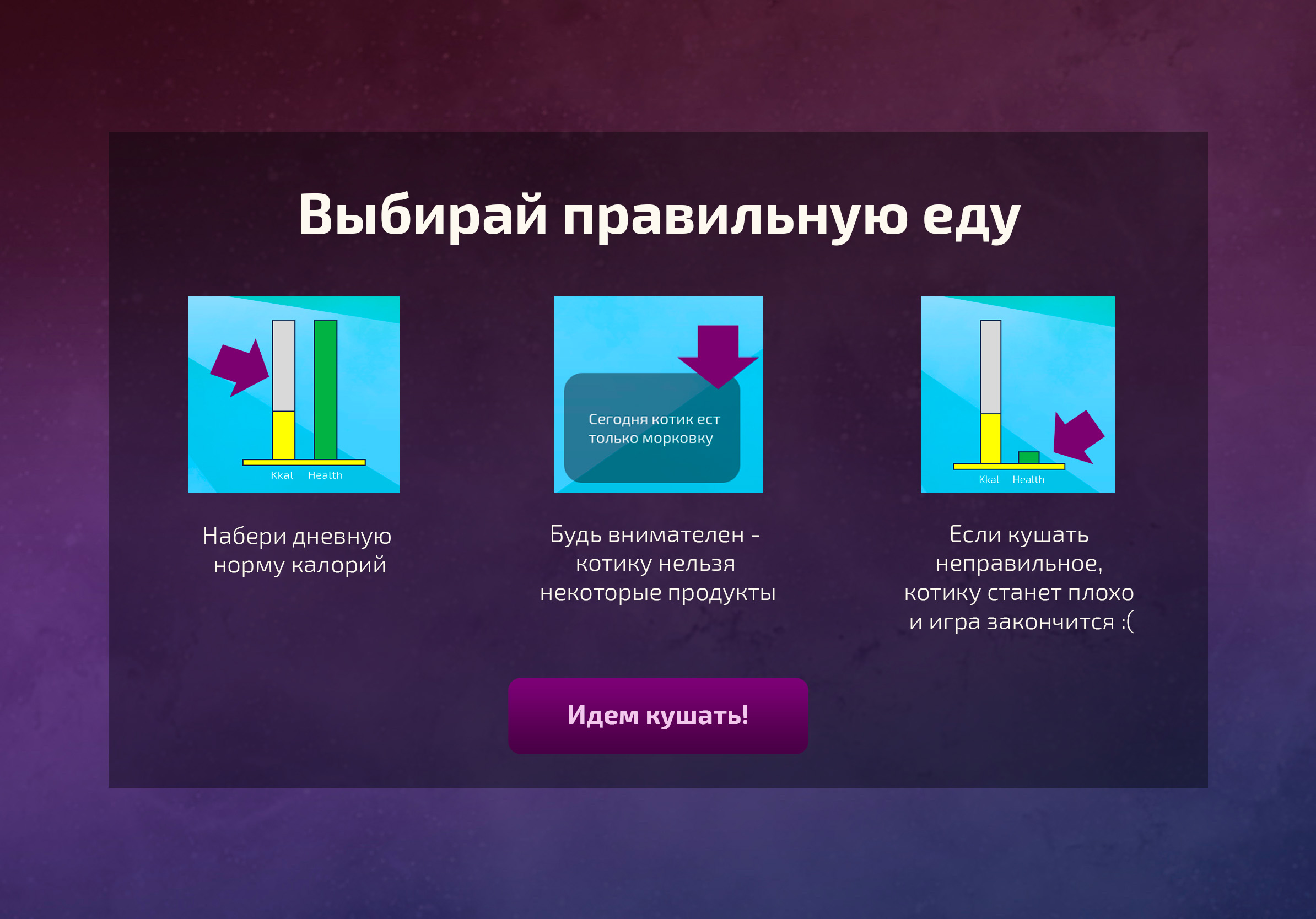 aboutGamePage.description: Помоги котику разобраться в правильном питании! Кушай нужное, не кушай ненужное, узнавай интересные факты о знакомых продуктах!
