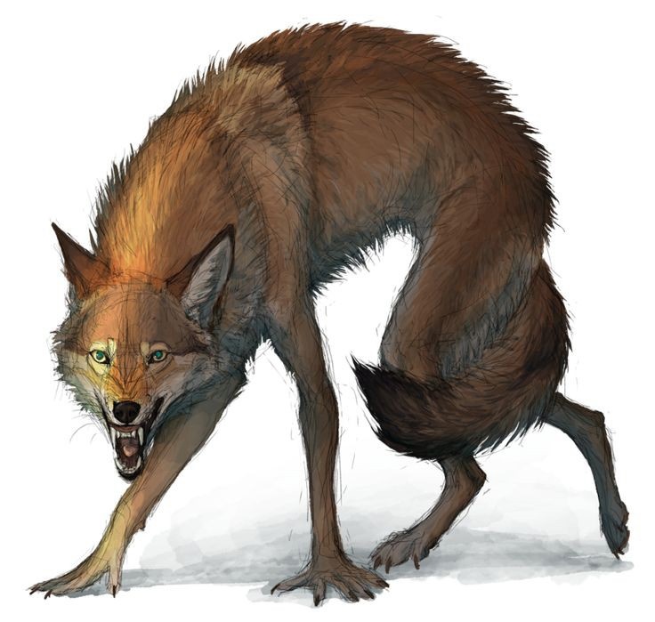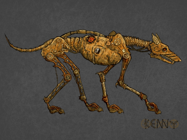 Механические собаки с шерстяной оболочкой, очень напоминающие койотов. Местами видны металлические части и содранное шерстяное покрытие.