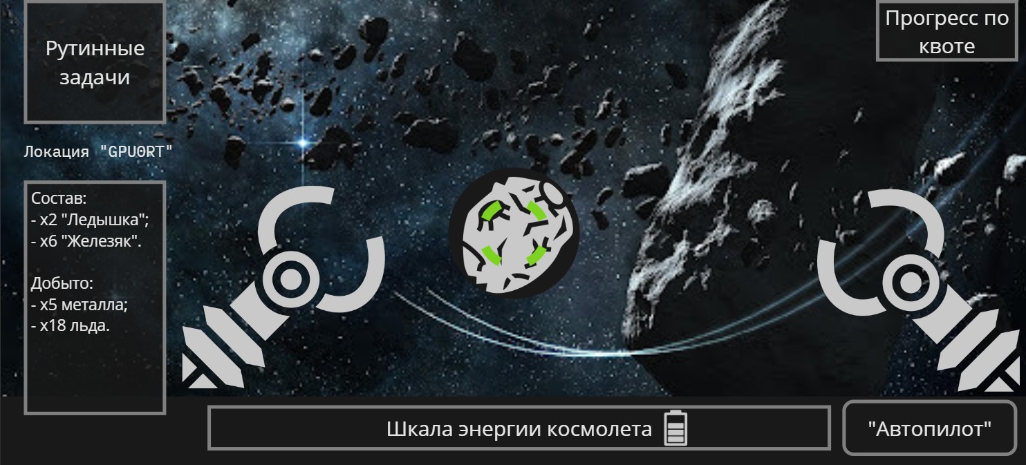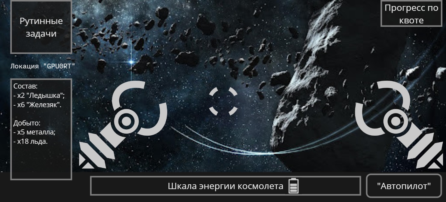 - Разбивать большие Астероиды и собирать маленькие в грузовой отсек Космолета.