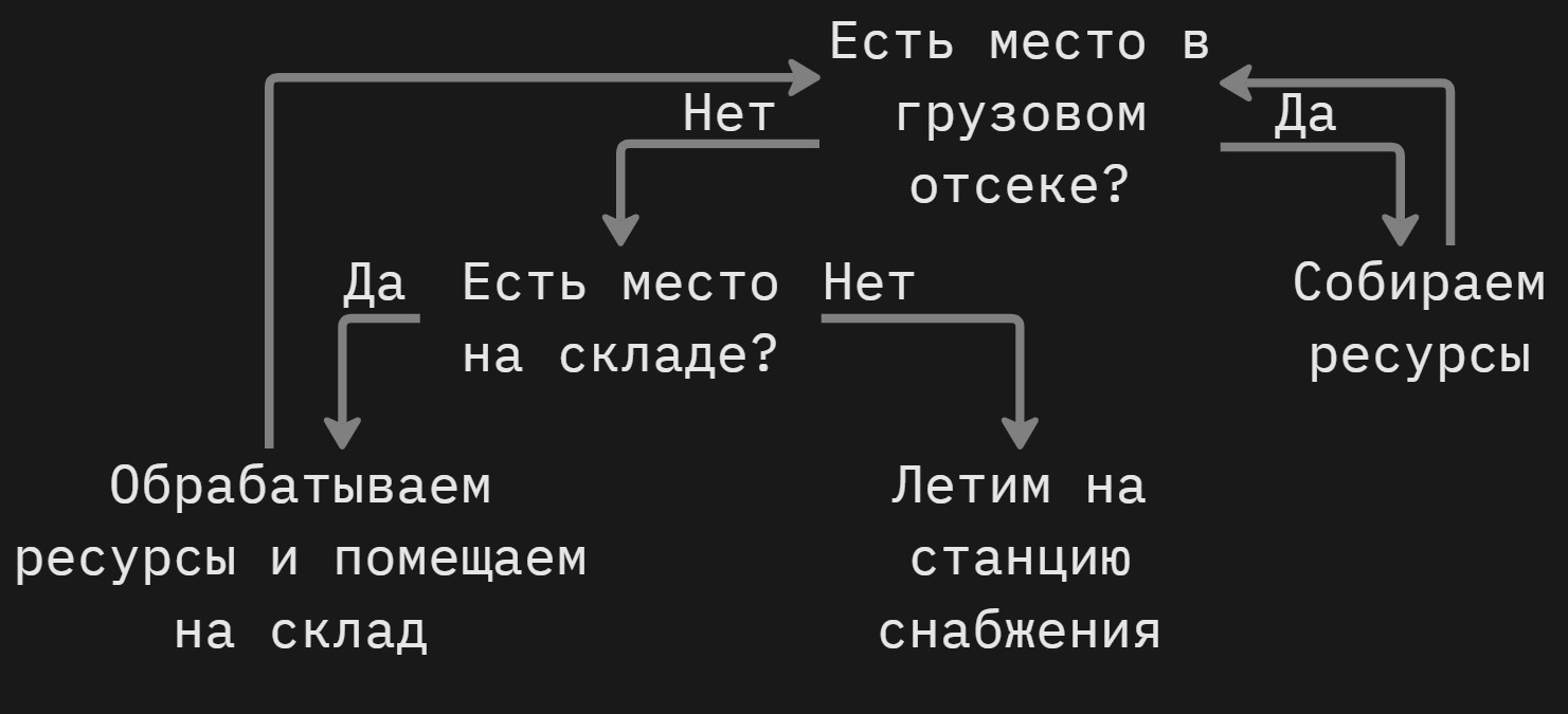 Грузовой отсек Космолета вмещает ограниченное количество ресурсов (см. Ресурсная схема). Чтобы освободить место, ресурсы можно убрать на склад, но перед этим их необходимо обработать и расфасовать в контейнеры.