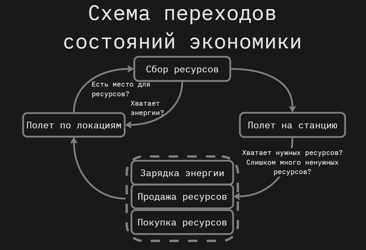Состояния "Продажа ресурсов", "Покупка ресурсов" и "Выполнение квоты" тесно связаны и могут по-разному чередоваться, но зачастую первым происходит "Продажа ресурсов".