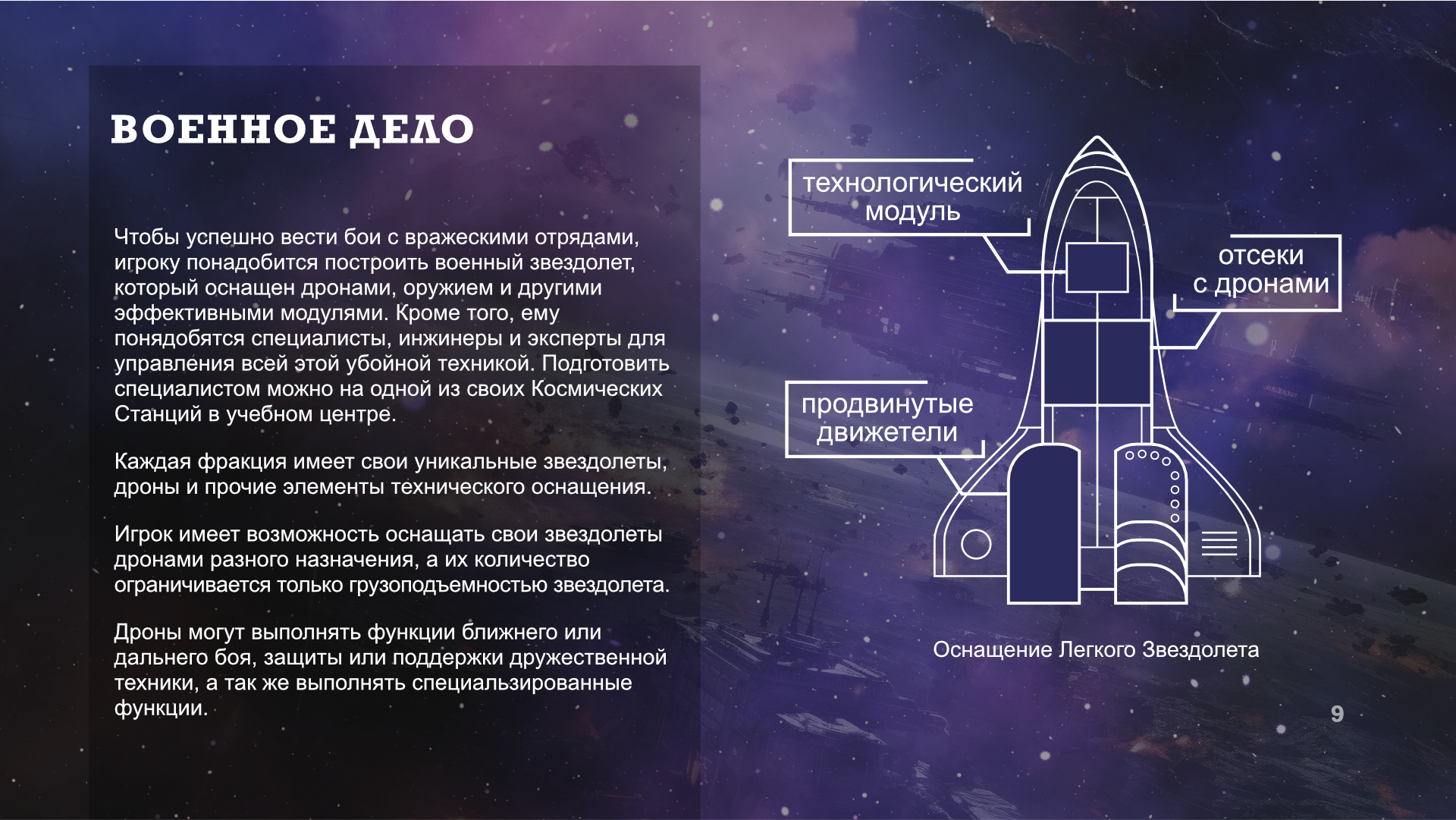 Чтобы успешно вести бои с вражескими отрядами, игроку понадобится построить военный звездолет, который оснащен дронами, оружием и другими эффективными модулями. Кроме того, ему понядобятся специалисты, инжинеры и эксперты для управления всей этой убойной техникой. Подготовить специалистом можно на одной из своих Космических Станций в учебном центре.