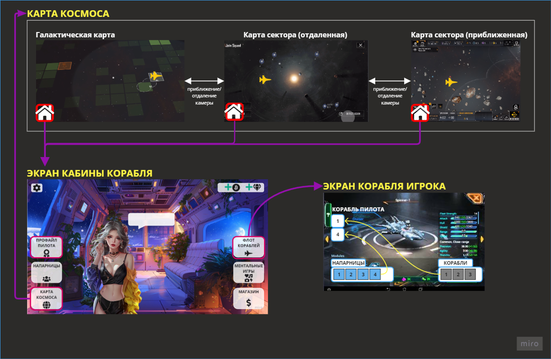 - HUD элементы по минимуму - для более глубокого погружения в окружающий космос. Предпочтение к его интерактивным элементам. Основной инструмент Интерфейса - всплывающая информация, которую дает AI-напарница.