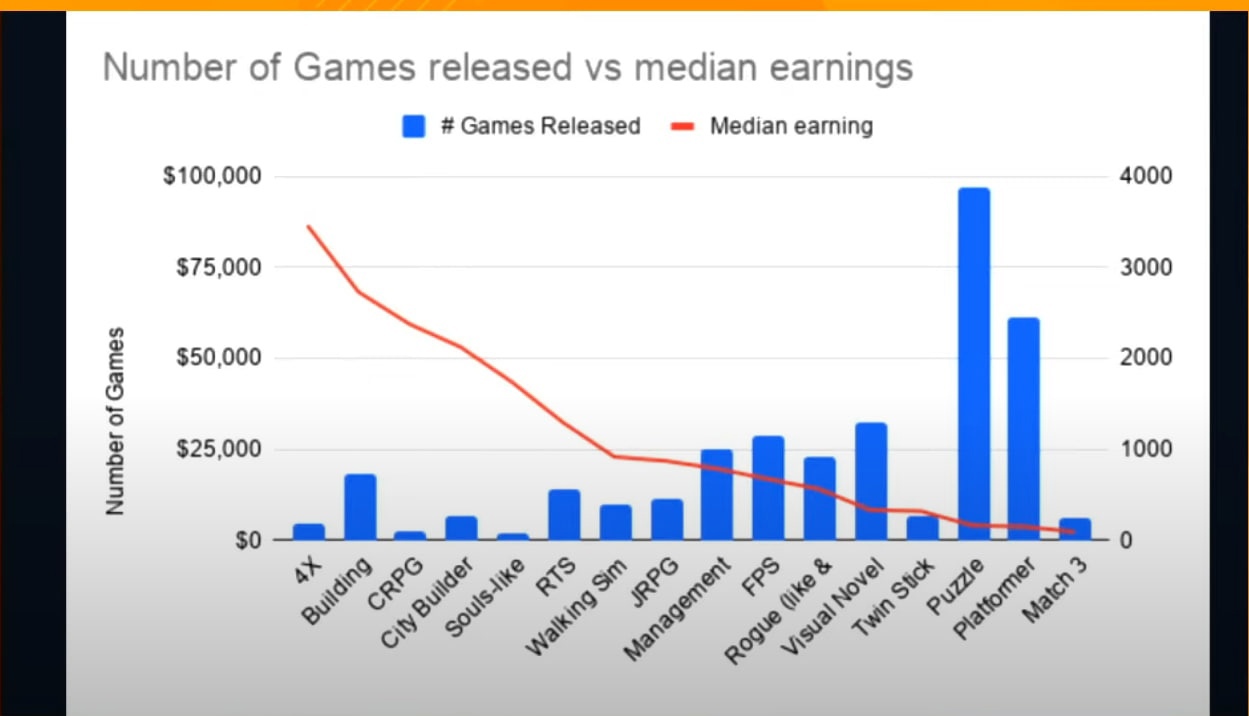 Ниже также приведен график, по которому можно определить, что игры в жанре roguelike с бесконечным геймплеем (высокой реиграбельностью), в мрачном и жестоком сеттинге привлекают высокий интерес пользователей Steam.