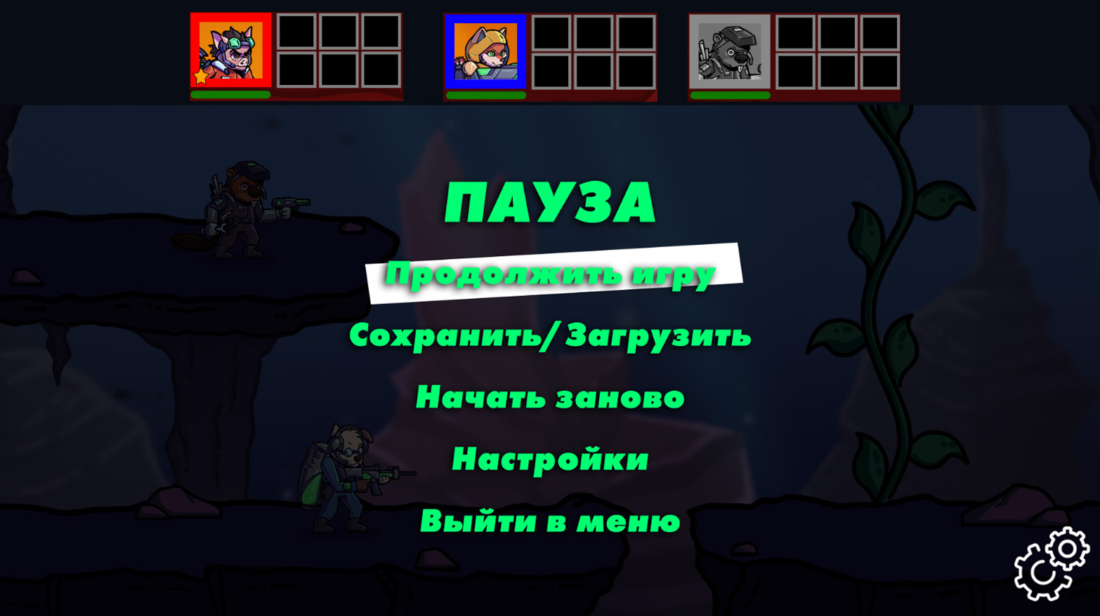Игровой UI состоит из пяти иконок персонажей. Активными являются те иконки, которыми играет игрок или два игрока. Рядом с каждой иконкой расположено по 6 ячеек инвентаря. Звёздочкой отмечен тот персонаж, который в приоритете для слежения камерой.