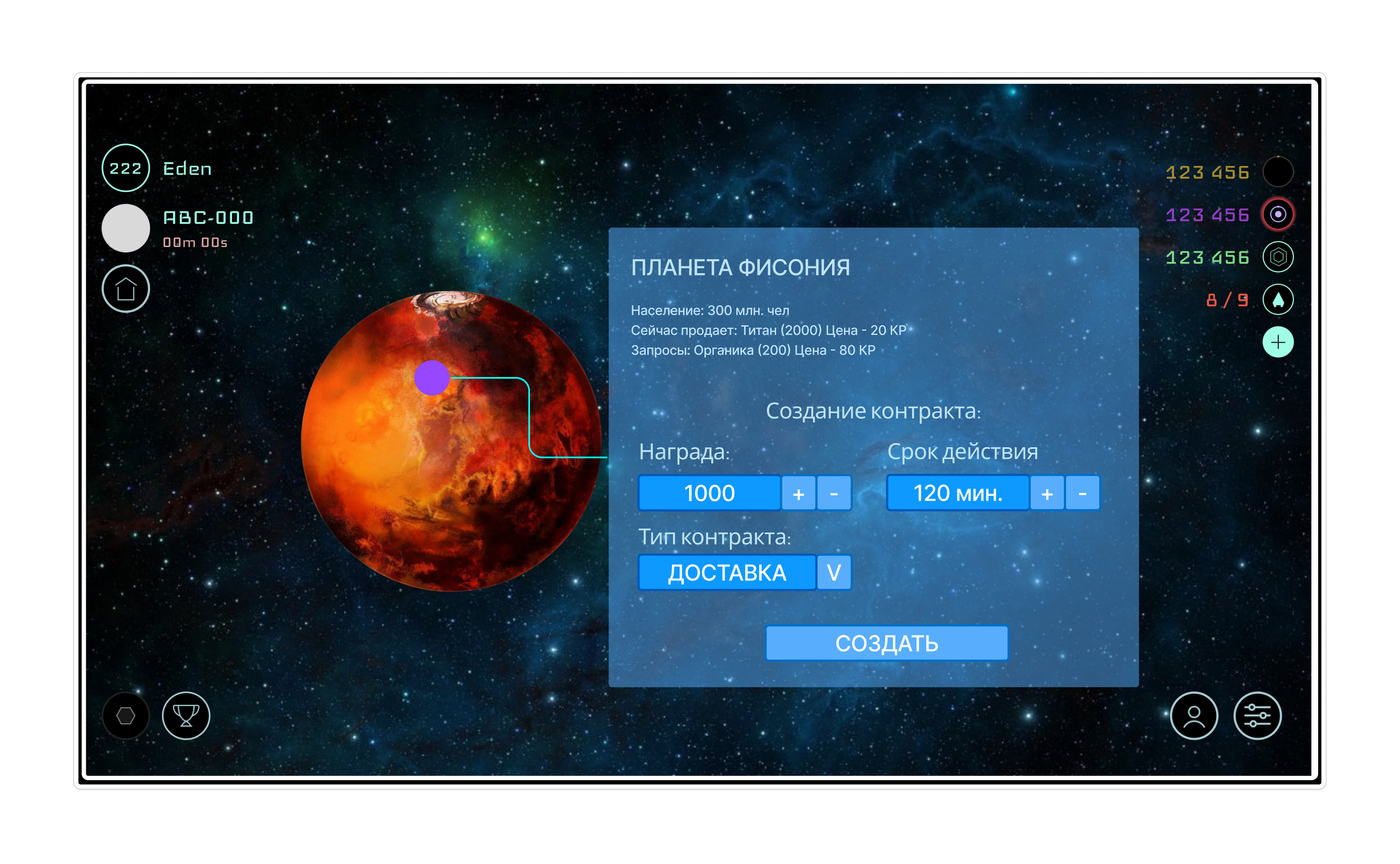 Интерфейс минималистичный, в темно-синей гамме, с плоскими иконками. В первую очередь элементы управления будут оптимизированы для мобильных устройств в ландшафтной ориентации. Для игры будет достаточно двух пальцев - для нажимания на кнопки, пролистывание списков, выделения объектов и панорамирования обозреваемого участка космоса. Для игры в web и десктопной версии будет достаточно трехкнопочной мыши с колесиком , но для удобства Игрока будет добавлено несколько горячих клавиш