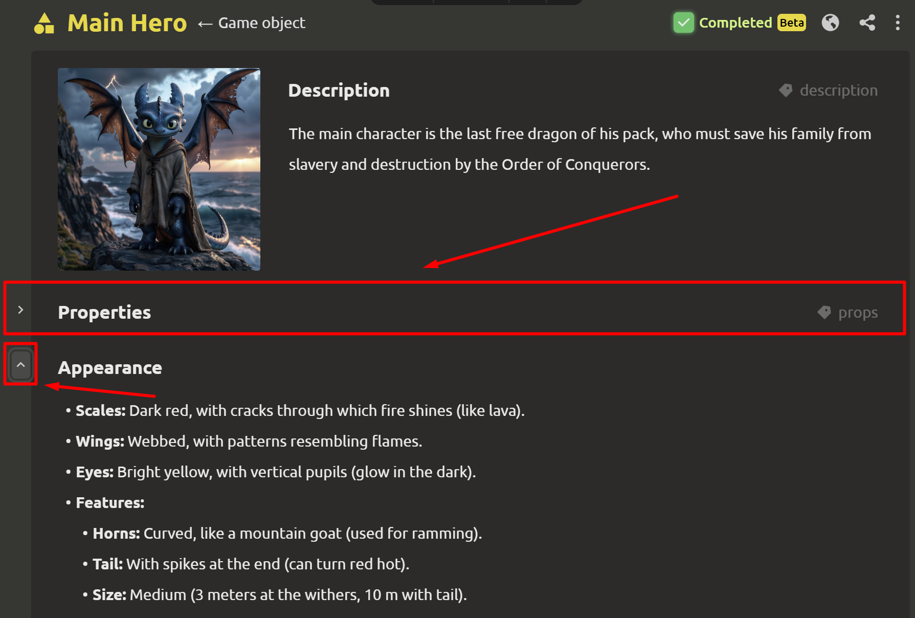 You can now collapse large blocks of mechanics or design descriptions in elements. This is a great way to combat information clutter and make your document more readable. Collapse the complex mechanic description for the "Curse of the Golden Idol" so it doesn't interfere with level design.