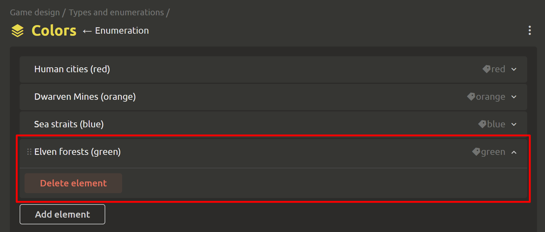 Working with enumerations has become clearer and more convenient! Elements are arranged one below the other. Each element contains a display name on the left, and a service name (a unique identifier that distinguishes one enumeration value from another) on the right. Editing fields is as simple as double-clicking. To delete an element, open the menu and click the corresponding button.
