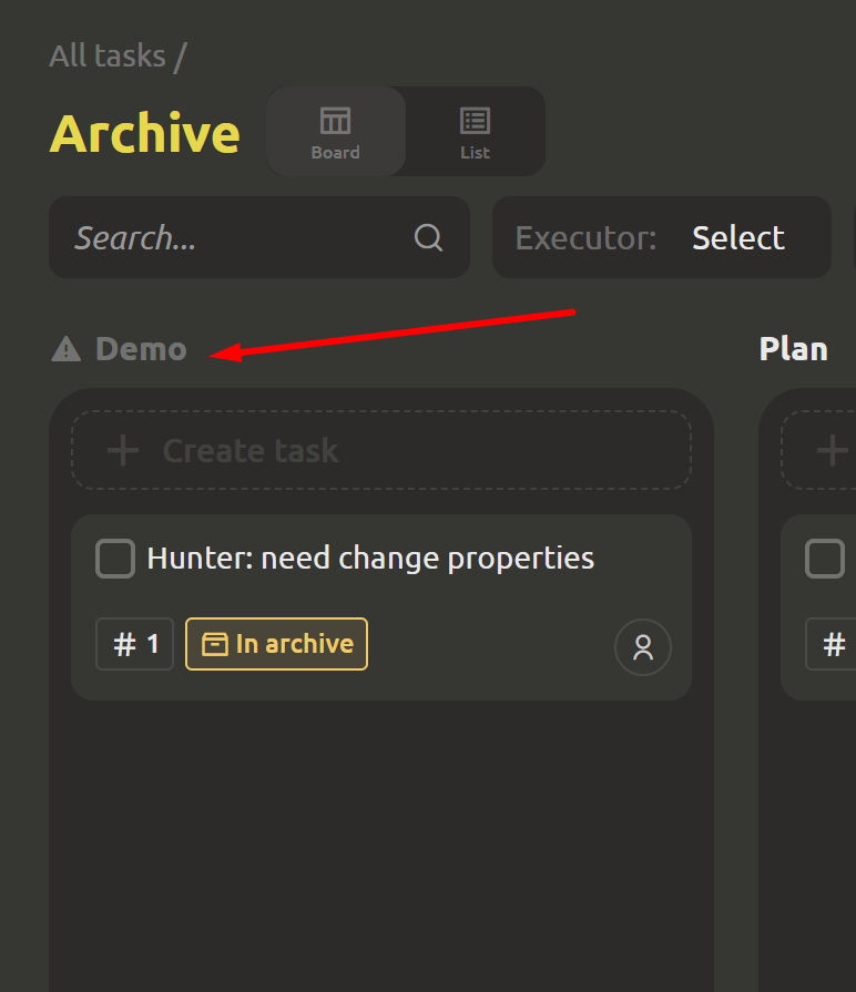 If the task was archived, but its column was deleted, the task will not be lost. It will automatically move to a special service column marked with a warning sign. These columns cannot be moved or renamed.