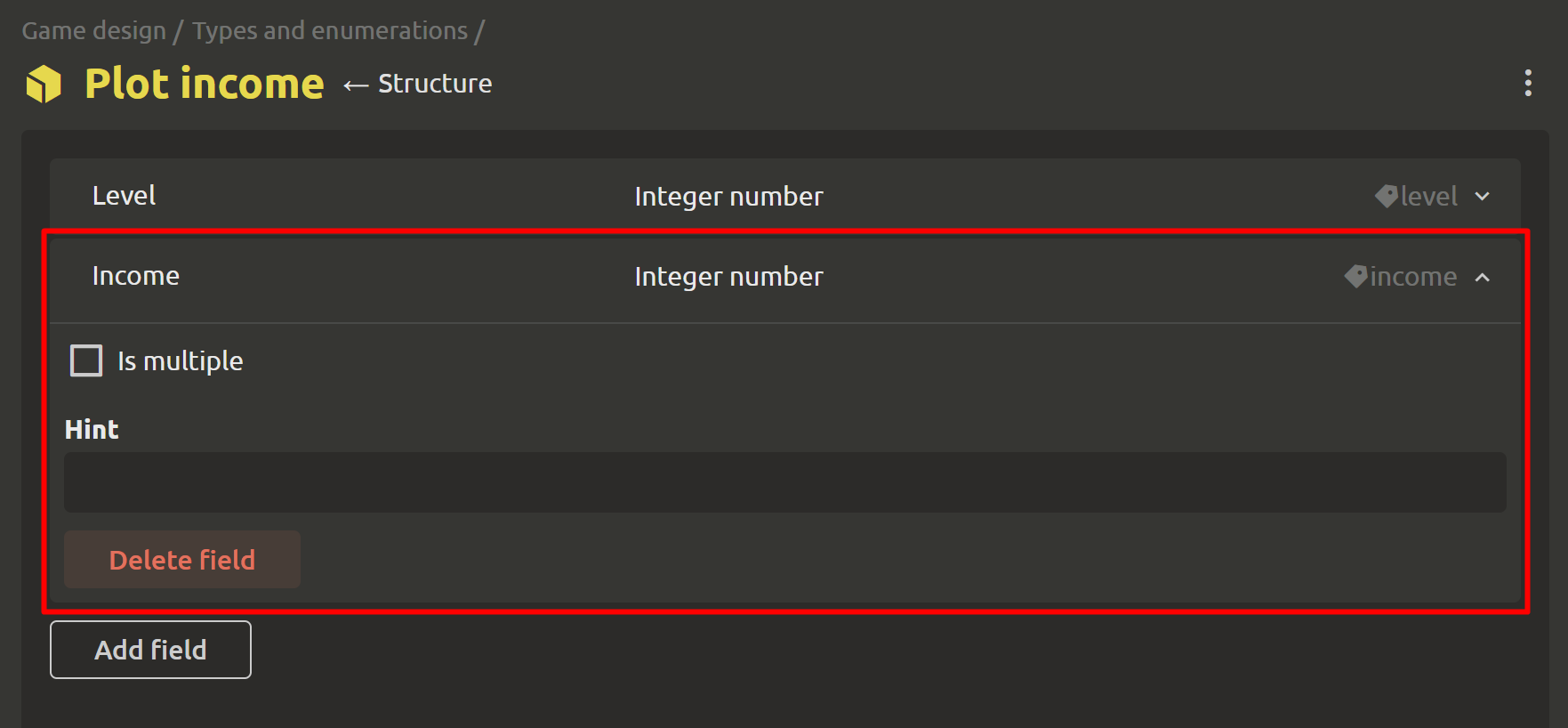 As for structures, their interface has been completely updated. Each field now displays its display name (left), type (middle), and service name (right). A drop-down menu provides access to all additional options, including multiplicity, tooltip, and more.