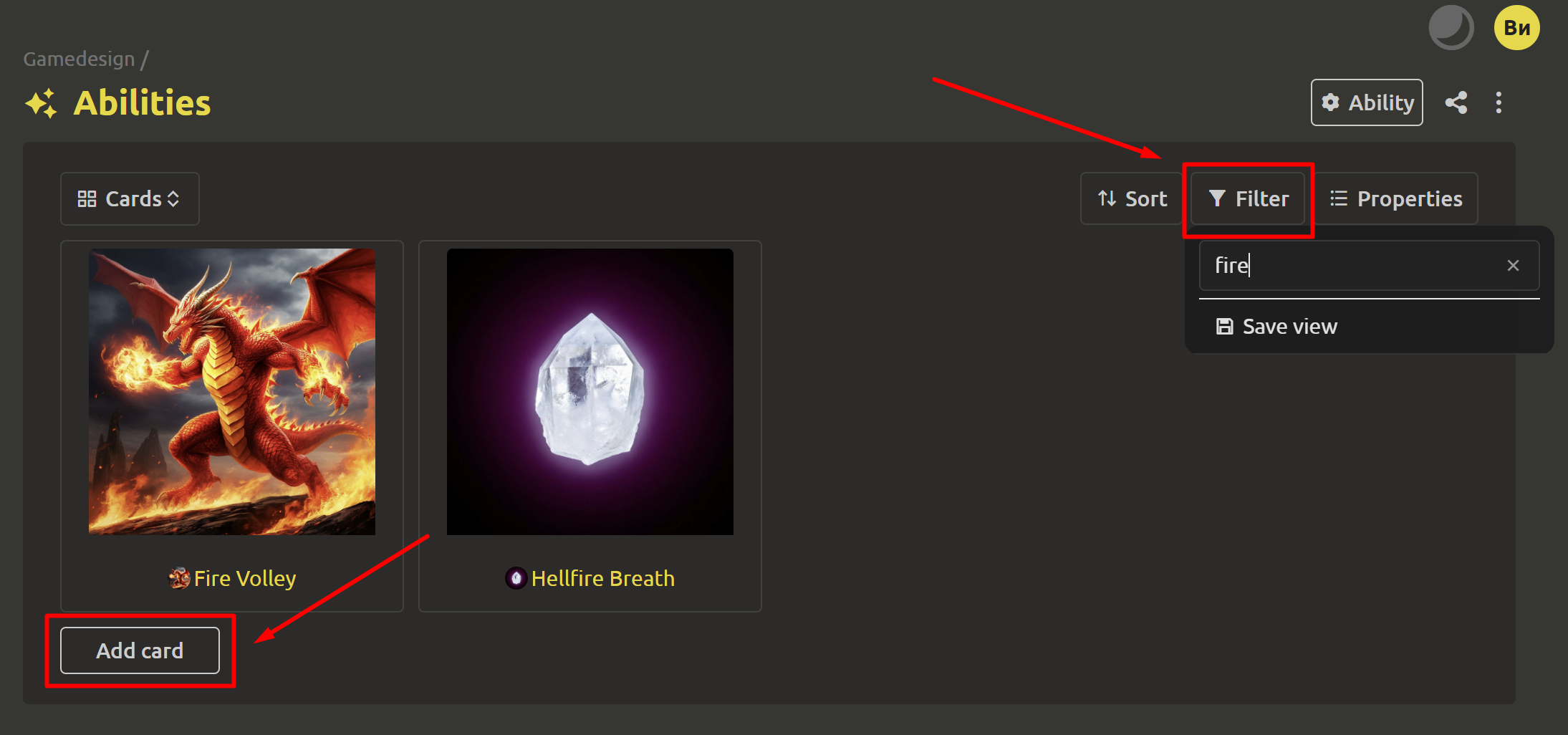 When browsing the contents of a collection, you can set a search condition and save it as a filter. For example, you could create separate tabs for level 1 abilities, level 2 abilities, and so on.
