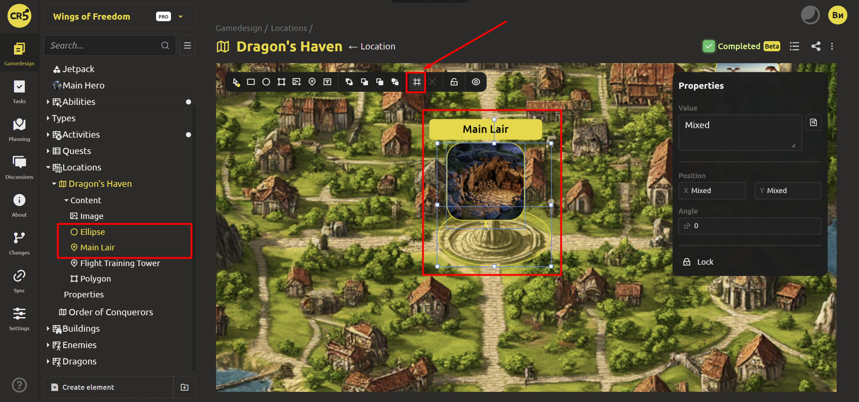 You can now combine multiple elements into a single group and work with them as a single unit—for example, combining a pointer and a region. First, select the elements while holding down Ctrl in the left menu or Shift in the editor itself. Then, click the grid icon to group them.